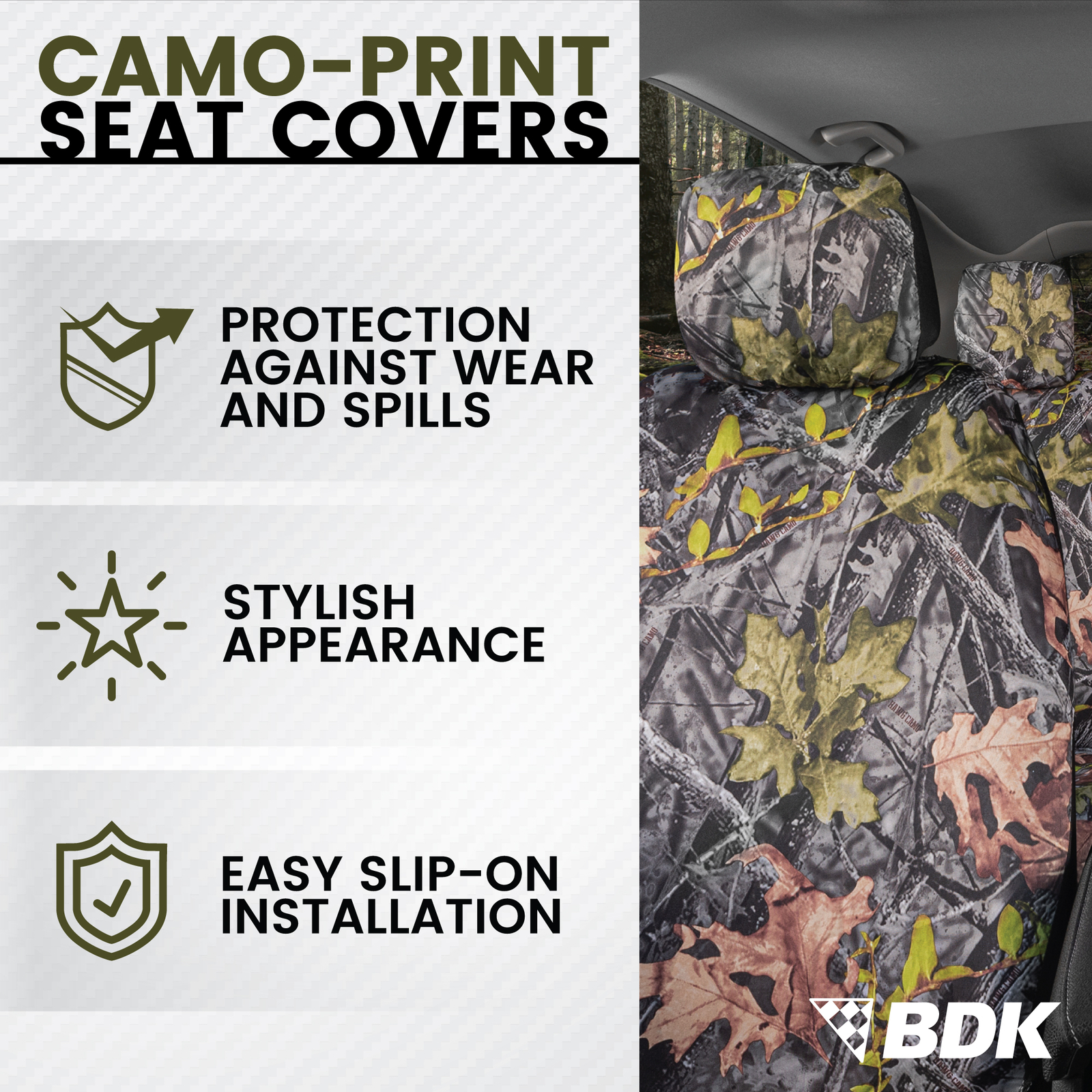 Follow us on social media floor mats seat covers car covers hub caps FREE SHIPPING IN ALL 48 CONTIGOUS STATES FREE RETURNS FREE 30 DAY RETURN POLICY DAILY UPDATES WE BRING THE LATEST ITEMS SUPPORT 24/7 Contact us via ebay Camo Car Seat Covers Full Set for Auto Truck Van SUV Protectors Camouflage DESCRIPTION Classic Maple Forest Pattern Camo Constructed of polyester, the fabric has a soft touch and feel and conforms to your body to create a comfortable car ride. Protect your car from accidents, spill, mud, dirt, sand, and other mess Great for sedans, vans, trucks, or SUVs The seat covers are made from polyester enforced with a sponge backing, which can provide specific advantages over natural fabrics, such as improved wrinkle resistance, durability and high color retention. They are also more water resistant than standard covers. The durable polyester material is soft and flexible, providing comfort by conforming to your body. Includes 2 front bucket seat covers, 2pc rear bench cover, and 5 headrest covers. WARRANTY INFO Free 365 Days Buyer Protection Program Our team works hard for you. Because we have such great relationships with our vendors and manufacturers, we also would like to pass on some of the benefits that we have as a retailer back to our valued customers in the form of warranty and buyer-protection program. Items in the categories of Automotive Accessories are covered by our 365 days buyer-protection program. However any perishable goods such as Airfreshner and etc. are not covered. If you need more information regarding warranty or have any question, please contact us anytime! SHIPPING INFO TERMS & CONDITIONS RETURNS INFO Coast to Coast Shipping From CA and NJ Warehouses We Ship from our two major warehouses in California and New Jersey Since we have multiple warehouse unlike others, we can ship the items faster! Any orders destined for HI, PR, AK and non-contiguous US states will incur small extra cost. 1 Day Business Day Processing Time Guarantee All orders are processed within 1 business day. Any express, changes, or cancellations must be received before 8AM PST. However we cannot guarantee changes after the mentioned cutoff time. Each orders will be shipped from our closest distribution center. All changes and cancellations must be received before 8AM PST. We are not responsible for shipping fee if buyer decided to ship the item using their own carrier. 100% FREE RETURNS WITHIN 30 DAYS* To ensure highest customer satisfaction, we provide 100% free return service! If the product different from what we have described? Return it! If the size is or fitment guide is wrong? Return it! In case you are not satisfied or have any kind of question, please call or email us and let us help you. *For all International order buyers are responsible for returning the package TIPS TO ENSURE THAT YOU ITEM and SHIPPING IS CORRECT Please always verify the address during checkout When paying with PAYPAL, please ensure that the shipping address on paypal is the desired address. Please ensure that the item matches your desired fitment EASY 3-STEPS RETURN PROCEDURE Fill out Return Materials Authorization form (We will send it to you) Attach the original invoice Return the item with RMA and original invoice CAUTION: We cannot re-route shipments with INCORRECT Address. Buyer is responsible to re-route or obtain package. We are not responsible for wrong ordering color, size, incorrect or invalid address, phone # or email NOTE: If you are reporting loss package, please contact your respective local USPS or UPS office. If you have any other questions or concerns, please Send us eBay message WARNING: This product contains chemicals known to the State of California to cause cancer and birth defects or other reproductive harm Return is allowed except for the following reasons: Used or damaged goods (due to use) cannot be returned Wrong address Incorrect or invalid quantity entered Invalid address or unmatching information The following items must be included when returning: Package or item must be in original condition and must be used. Must be within contiguous 48 US States Must provide a valid reason for return Your shipping name must be the same or a verified buyer Valid contact information such as phone, address, name, payment method Must be submitted within 30 days of the purchase of the item A valid RMA# must be accompanied with every return Exclusive Automotive Accessories Your One-Stop Shop for the Best in Auto Accessories. Seat Covers, Floor Mats for Cars, Trucks, Vans & SUVs available in hundreds of varieties of patterns, styles and materials.