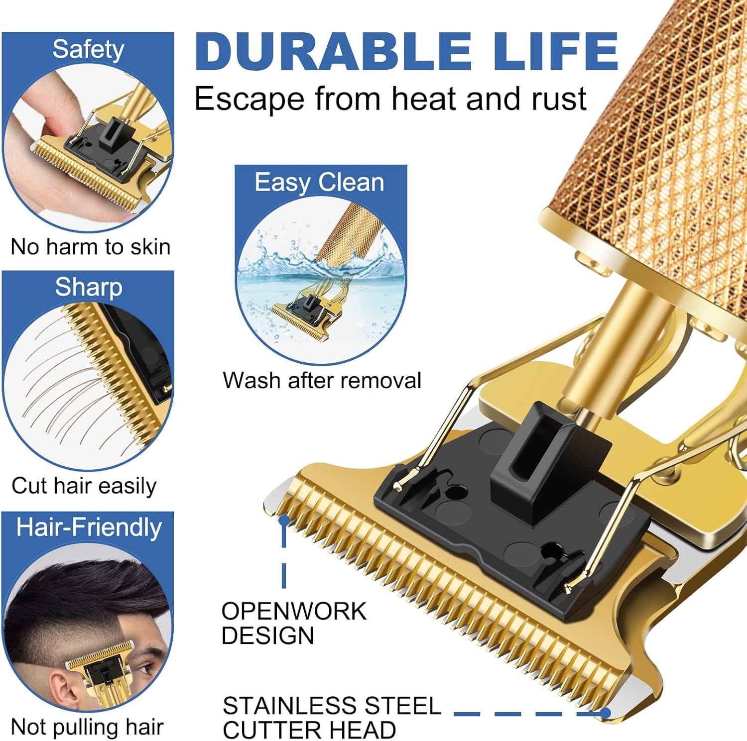 candyfouse Hair Clippers for Men, Rechargeable Beard Trimmer with 4 Gold Product Details Package Dimensions : 7.64 x 3.46 x 1.5 inches; 10.97 ounces Item model number : MR04095 Batteries : 1 Lithium Ion batteries required. (included) Manufacturer : candyhouse Country of Origin : China Recommended Uses For Product: haircut Color: Gold Hair Type: All Brand: candyfouse Power Source: Battery Powered 【T-type 0 Cutter Head Design】 This clipper adopts T-type 0 Cutter Head design. The head made of stainless steel is 4cm wide. It is very suitable for regular use and hairstyle carving, The blade is very sharp but never hurts the skin. It is equipped with a cutter head protection cover to prevent cutter head wear.The cutter head can be washed directly with water. 【Powerful Motor】The beard trimmer men has a powerful copper core motor, smooth and does not get stuck in the hair. 8500 rpm speed, low frequency vibration, low noise, noise is less than 60 decibels. 【Precise Haircut】There are 4 guide combs of 1.5mm / 2mm / 3mm / 4mm, providing a variety of choices for your hairstyle, helping you better control the length and get the hairstyle you want at home. 【Lightweight and Portable】The hair clipper has a lightweight and stylish design, with a small body, portable and easy to use, an ergonomic handle and a one-button switch under the fader for added convenience and safety.ideal for tourism and business travel. 【Easy to Clean】Simply rinse the blade under running water for quick and hygienic cleaning. Note: Please do not immerse the entire hair clipper in running water. Hair Clippers for Men