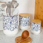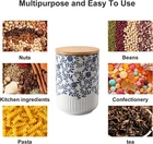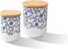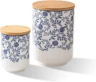 About this item 【Kitchen Canisters Sets】 This set includes 3 blue kitchen canisters, offering a variety of sizes to meet your storage needs. The height and diameter of these spice jars and flour sugar jars are 5.6*7.9 inches, 4.6*6.1 inches and 3.65*5 inches respectively, please note that due to the different densities, the solid storage capacity may not reach the maximum. 【Durable Ceramic Canister Set】 Crafted from sturdy ceramic, these containers are more durable than plastic or glass, ensuring long-lasting use. The bamboo wooden lids, equipped with silicone sealing rings, provide a tight seal to keep contents dry and fresh. 【Easy to Clean and Use】 The smooth surface of the ceramic jars makes them a breeze to clean. They are dishwasher-safe for your convenience, while the wooden lids should be hand-washed and dried promptly. To seal, simply rotate and press the lid simultaneously. This ensures your cookie jars with lids remain airtight and your tea storage is decorative yet functional. 【Versatile and Practical】 These airtight food containers are highly versatile, suitable for storing a wide range of dry goods including snacks, flour, cookies, sugar, salt, pepper, coffee powder, coffee beans, spices, candies, nuts, oats, dried beans, and pet food. The wide-mouth design allows for easy access and retrieval, making them excellent kitchen counter decor and practical kitchen containers. 【Thoughtful Holiday Gifts】 Featuring a combination of small, medium, and large sizes, this set is thoughtfully designed to cater to various storage requirements. Whether it's for Christmas, Mother's Day, Valentine's Day, birthdays, or housewarming celebrations, these kitchen sets make for practical and stylish gifts for friends, family, or colleagues. They serve as both decorative storage and essential kitchen containers. Brand: Color: Blue (74oz + 36oz + 18oz) Material: Ceramic Material Feature: Reusable Product Dimensions: 5.6"L x 5.75"W x 7.9"H