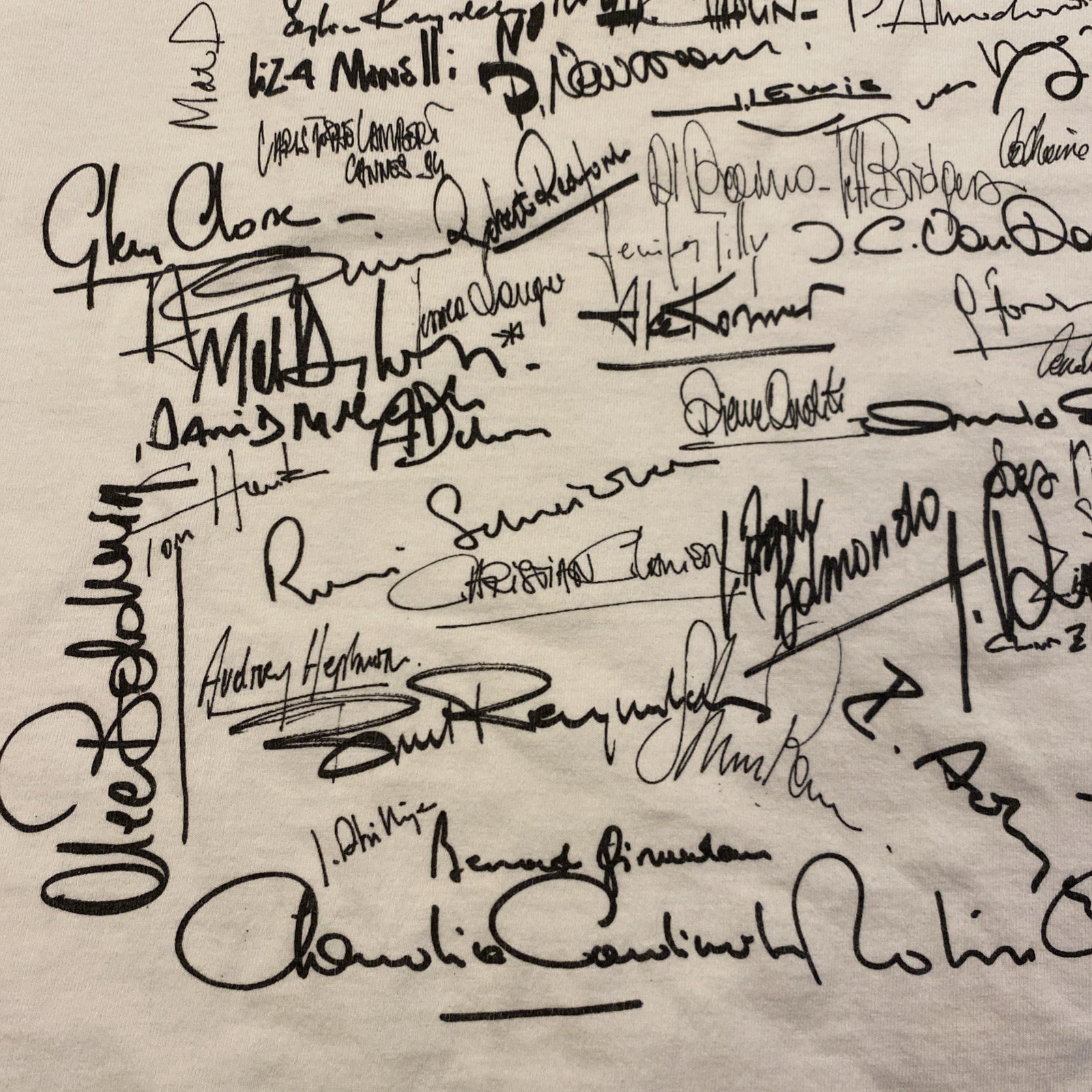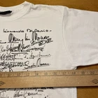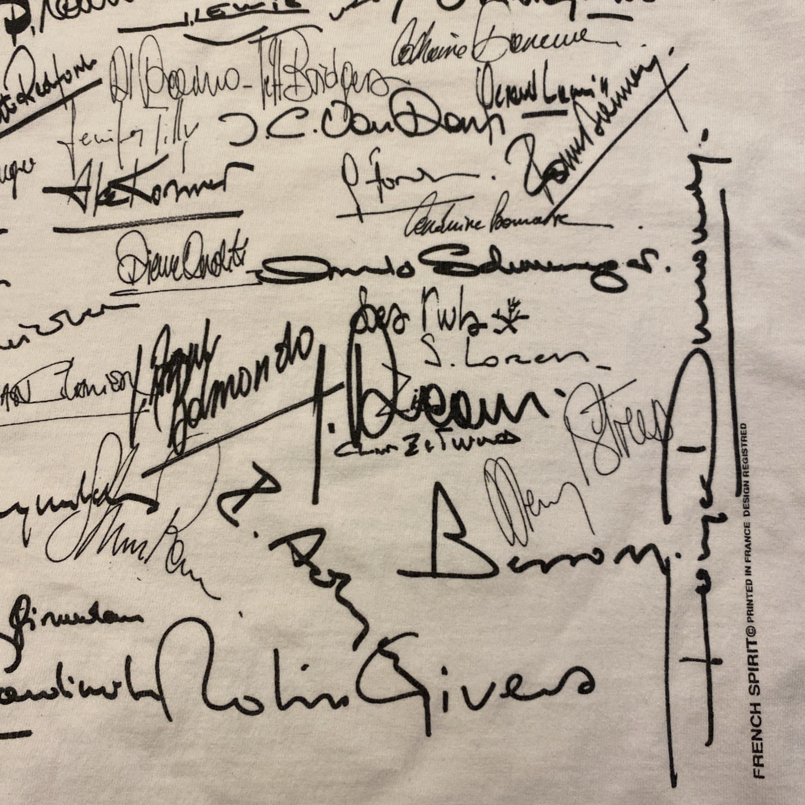This product is a stylish T-shirt perfect for fans of the Cannes Film Festival. The design includes autographs and memorable moments from the prestigious film festival, making it a must-have for any movie enthusiast. Made in France, this medium-sized shirt is a great addition to any wardrobe for those who appreciate the glamour and excitement of the Cannes Film Festival. Liza Minnelli, Tom Cruise, Woody Allen, Sharon Stone, Jerry Lewis, Robert Redford, Patrick Swayze, Leonardo DiCaprio, John Wayne and many more. This is a pre owned T shirt please look over pictures and measurements