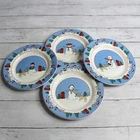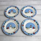 Canterbury Potteries, Ltd. Vintage 2006 Family Holiday Designed by Toby Pieri Stoneware Dinnerware Round Salad Plates - Could be used as snack or luncheon plates too 8" Diameter Dishwasher and Microwave Safe Colors: Blue White Green Red Tan and Black Theme: Winter Christmas Holiday Snowman Snowmen Golden Retriever Puppy Dog Lover Whimsical Snow Snowflake Lot of 4 This lot includes a set of four 8" plates. They are slightly vintage and are in excellent hardly used condition. I have several other pieces listed too that match this same dinnerware collection.