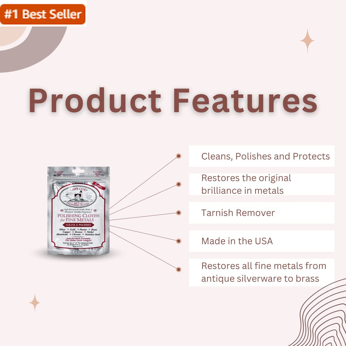 Cape Cod Polishing Cloths for Fine Metals | Jewelry Cleaner and Tarnish Remover | Silver Polishing to a Brilliant Shine | Foil Pack of (2) 4X6 Cloths Cleans, Polishes and Protects: The perfect fine metal polish for any restoration or maintenance project. Restores all fine metals from antique silverware to brass andirons. Works great on silver, pewter, brass, copper, chrome, stainless steel, platinum, and nickel. Fantastic for fine jewelry and watches as well. Tarnish Remover: Our moist polishing cloth removes old tarnish, restores the original brilliance in metals, prevents new tarnish, and gives your valuables a layer of protection with our revolutionary anti-tarnish finish. Fine jewelry and silver polishing: Whether you are an avid coin collector or just looking to clean and protect decades old valuables to a brilliant shine, Cape Cod Polishing Cloths is the perfect polishing cloth for jewelry, watches, and other fine valuables. Easy to use and a pleasant smell: Simply wipe on and buff off with a soft cloth. Our polishing cloths have a pleasant vanilla fragrance and leave no excess liquid or residue in crevices as cleaning pastes or liquids often do. Made in the USA: Each re-sealable foil packet contains (Two) 4x6 inch moist polishing cloths ready to clean, polish and protect any type of metal. All products are manufactured on Cape Cod, Massachusetts. Cape Cod Polishing Cloths for Fine Metals. Foil Pack of (2) 4x6 Cloths moist polishing cloths ready to clean, polish and protect any type of Metal. Each cloth cleans, polishes, and protects metals with tarnish build-up using just the right amount of pre-moistened solution on each cloth. The Cape Cod polishing cloth is the perfect fine metal polish for any restoration or maintenance project. Restores all fine metals from antique silverware to brass andirons. Works great on silver, pewter, brass, copper, chrome, stainless steel, platinum, and nickel. Fantastic for fine jewelry and watches as well. Item model number 8821 Number of Items 2 Product Dimensions 0.16 x 4.2 x 7 inches; 0.53 ounces Material Metal Country of Origin USA Manufacturer Cape Cod Polish Co. Is Discontinued By Manufacturer No Brand Cape Cod Size 0.53 Ounce (Pack of 1) Shipping Fast shipping is very important for us. Our standard US shipping service is FREE. Your order will be shipped within 2-3 business days upon full payment received. Your order will be delivered within 2-3 business days after the handling time. We only ship to the confirmed PayPal address. We reserve the right to cancel any order for any reason at any time. We are not responsible for undeliverable addresses. Returns and payment We offer a 30 days return policy from checkout winning date. We allow only PayPal as payment method FeedBack Your feedback very important to us, after you get your package and you are satisfied with our service please leave us positive feedback If you have any problem with your order / any questions please before leave any type of feedback For any questions, using eBay contact system Please visit our eBay store to check out other items for sale! Thank you for shopping at our store.