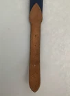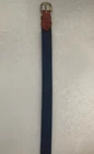 Measures 44” overall. Good condition. This vintage nautical style belt features a blue leather and canvas construction with brass buckle accents. With a size of 40, this Cape Cod Needlepoint Belt showcases a charming lighthouse design in red, perfect for those who appreciate nautical and beach-themed accessories. The belt is versatile, suitable for both casual outings and work attire, making it a stylish addition to any wardrobe for men who enjoy a touch of classic Americana in their accessories.