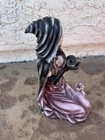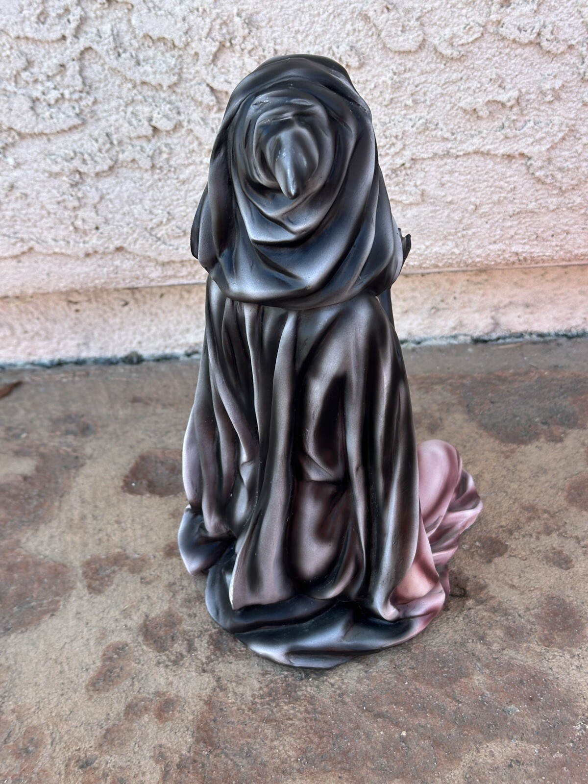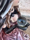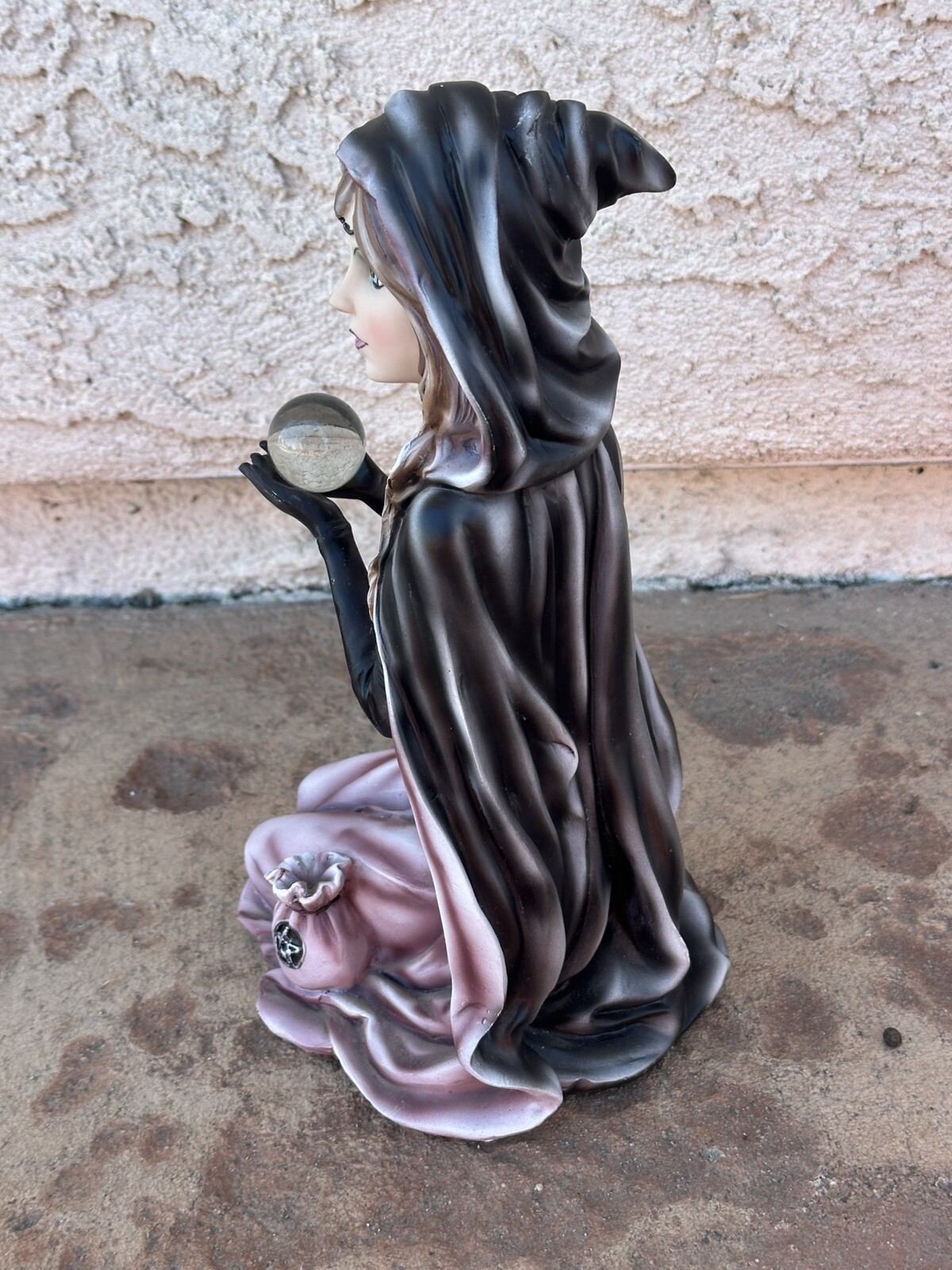 This large black resin figurine features a Wiccan witch with a crystal ball, part of a Pagan collection. The figurine has a glossy finish and a 3D effect, making it a striking addition to any room. It is designed as a candle house holder, perfect for all occasions and metaphysical enthusiasts.