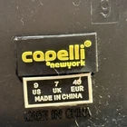 Elevate your rainy-day style with these Capelli New York black rain boots. The shiny finish and raised geometric pattern add a touch of glamour to these practical shoes. The mid-calf shaft style and round toe shape make them comfortable and stylish for casual wear. The boots feature studded accents and a low block heel for added fashion flair. These women's size 9 boots are perfect for any occasion, whether you're running errands or going out with friends. The boots are made of durable rubber material and are not customized. The UK size 7 and EU size 40 equivalent to US size 9. The vintage style and theme of the boots are fashion-forward and will complement any outfit. Worn twice.