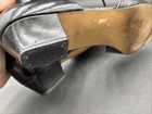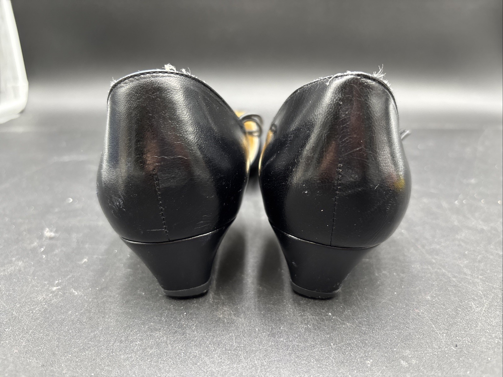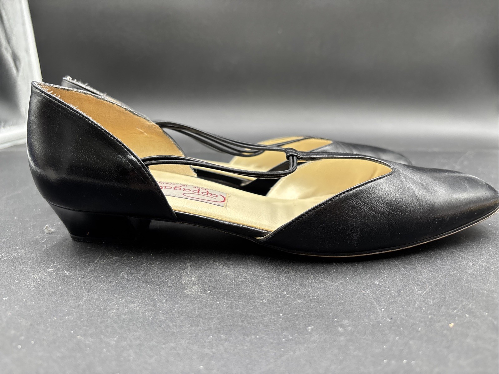 The Cappagallo Vintage Black Leather Kitten Heels in size 9M are stylish and timeless pieces for women. Featuring an almond toe shape and a low kitten heel, these slip-on heels are crafted from black leather with a strappy design. The vintage brand adds a touch of retro elegance to these classic shoes, making them a perfect addition to any wardrobe for both formal and casual occasions. Ideal for those who appreciate timeless style and quality craftsmanship.