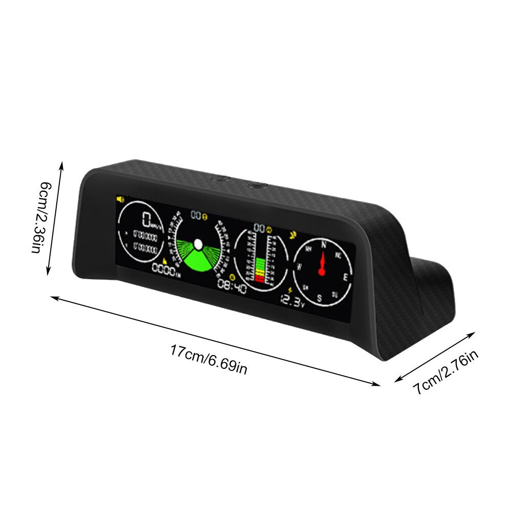 Features: *1. Multifunction - Intelligent GPS multi-function HUD speedometer supports high-precision monitoring of vehicle speed, vehicle pitch angle, vehicle roll angle, compass, time, and vehicle battery voltage status, ensuring your driving safety. *2. 3-in-1 Alarm System - Accurately displays the pitch and roll angle changes of the vehicle and sends a clear notification. When one or both angles exceed 40 degrees, negative or positive, the alarm will sound. Also cover the Overspeed and Fatigue Driving reminders. *3. High-definition LCD Display - Adopt high-resolution color LCD display with a built-in light sensor that adjusts the brightness of the screen day and night. Free rotation, more sensitive. After turning on the power, there will be backlight inside, which will help you see the screen at night or in dark conditions. *4. GPS Module - Equipped with a high-precision satellite GPS signal module. Automatically monitor vehicle driving conditions. Widely applicable to Asian cars, American cars, and European cars. *5. It can be connected to the vehicle OBD interface through a data line to read the real-time data output of the ECU, and supports the NINE OBD protocol. Size: 170x70x60mm Function: *1. GPS satellite speedometer *2. Altitude display *3. Longitude and latitude display *4. Compass *5. Satellite time display *6. Overspeed alarm(>120km/h) *7. Fatigue driving alarm (driving continuously for 4 hours) *8. Vehicle roll angle *9. Vehicle pitch angle *10. Automatical screen brightness adjustment *11. Color HD LCD display Package Includes: 1 x HUD 1 x Cigarette Lighter Power Cord 1 x ACC Power Cord 1 x Instruction 1 x Anti-slip Pad