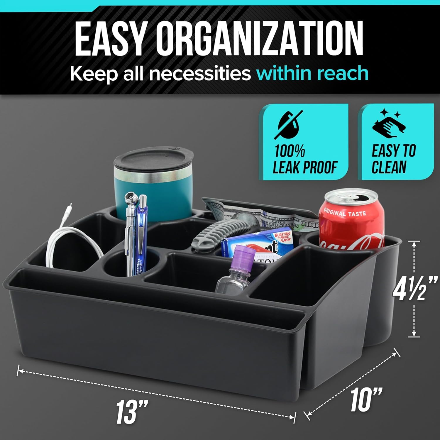 Store New Arrivals Add to Favorite View Feedback Contact Vehicle Seat Organizer Car Storage Caddy with Carrying Handle, 2 Large Cup Holders, 10 Compartments, Hidden Extra Storage, Fits Most Vehicles, Made in USA from Recycled Plastic Description Item model number 2180225-1 Number of Items 1 Item Weight 1 Pounds Number of Compartments 10 Color Black Product Dimensions 10"D x 13"W x 4.5"H Material Plastic Country of Origin USA Manufacturer Part Number 2180225-1 Item Weight 1 pounds Model 2180225-1 Special Features Compact Special Feature Compact Specific Uses For Product Automobiles 10 multi-sized compartments to keep necessities within reach Retractable carrying handle for easy transport Leak-proof design to prevent spills and messes Made in the USA with recycled plastics Hidden storage compartment to keep valuables out of sight Perfect for any vehicle, the Moblorg Vehicle Seat Organizer makes your car more organized than ever. Ten storage compartments, including two large cup holders, keep all necessities within reach – such as sunglasses, snacks, phone chargers, and more. The non-slip bottom holds the organizer in place, and a leak-proof design ensures your car will stay clean and mess-free for years to come. Made in the USA with durable recycled plastics, the Vehicle Seat Organizer also has a flip-top hidden compartment to conceal valuables such as wallets and keys. The organizer fits the passenger seat of most cars, trucks, SUVs, minivans, and RVs, and it can also be used in the trunk – or even in a classroom, in the garage, or under the sink! ABOUT US We offer the best prices around on high quality products. Our E-store includes media such as books, movies, music and games while offering electronics, toys, sporting apparel, clothing, tools, general home, garden items and more. SHIPPING We are always working hard to ensure your package arrives as soon as possible. Please understand that some factors like weather, high postal traffic, and the performance of shipping companies are outside of our control. We offer free shipping to the lower 48 states and ship within 2 business days of payment, usually sooner. We do not accept P.O. Boxes. Please provide a physical address. RETURNS We offer a 30-Day Return Policy on items which you are not completely satisfied with. You have the option for a full-refund or an exchange of the item. No returns are available on items shipped outside of the USA. PAYMENT We accept PayPal. CONTACT US This page content is yet to come Please ad us to your favorite seller and visit again later Thank You CUSTOMER SATISFACTION We try our very best to make sure every customer is completely satisfied. If there's a problem, message us! We're happy to help.