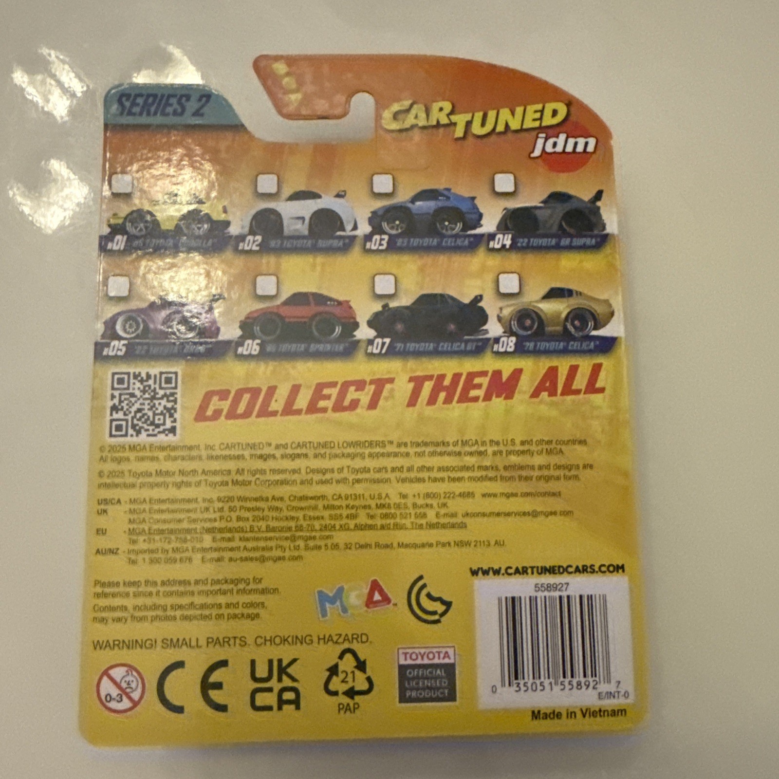 The product is a special edition 1:64 scale diecast toy car called the Car Tuned jdm 03 Series 2 ‘83 Toyota Celica, produced by MGA Entertainment as part of the Hot Wheels Vintage Racing series. The car is in a vibrant blue color and is a part of the Cars character family. This collectible toy vehicle is a must-have for car enthusiasts and collectors alike.