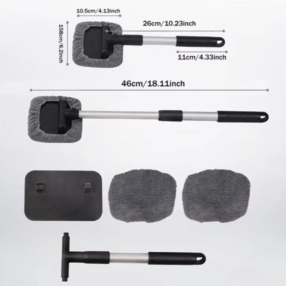 Windshield Wow Magnetic Car Window Cleaner Expandable Cleaning Supplies for Car Features 1. Multi functional and versatile design: This windshield window cleaner is an essential tool for both cars and homes. Its scalable design makes it suitable for various window sizes, making it very suitable for cleaning internal and external glass surfaces. 2. High quality microfiber mat: equipped with reusable microfiber mat and spray bottle, this window cleaner provides a gentle and effective method to remove dust, dirt and stains. The pad is washable and reusable, ensuring long-lasting performances and reducing waste. 3. Durability and Portability: The windshield and window cleaner is made of durable materials to ensure long-term use. Its lightweight and compact design makes it easy to store in cars or homes, and can be used anytime when needed. Whether you are traveling on the road or just cleaning at home, this cleaner is a must-have for keeping windows clean and shiny. 4. Easy to use and store: The windshield and window cleaner is designed for user friendliness and has a simple and effective mechanism to achieve smooth and controlled cleaning. Its compact size also means it can be easily stored in a car or home and can be used at any time. 5. Multipurpose: This windshield cleaner has versatile functions, high-quality materials, and accompanying accessories, providing excellent value for money. Whether you are a professional beautician or just looking to keep your car and windows clean, this tool is a good choice. Specification Material: aluminum alloy, ABS, PP, PVC, ultrafine fiber Dimensions: Handle retracted 27cm long, extended 45cm, pipe diameters of 16 and 19mm Color: Grey Size: 45 x 15 x 1 cm Weight: 195 g Package Include: 1x Handle 1x Base plate 2x Fabric cover