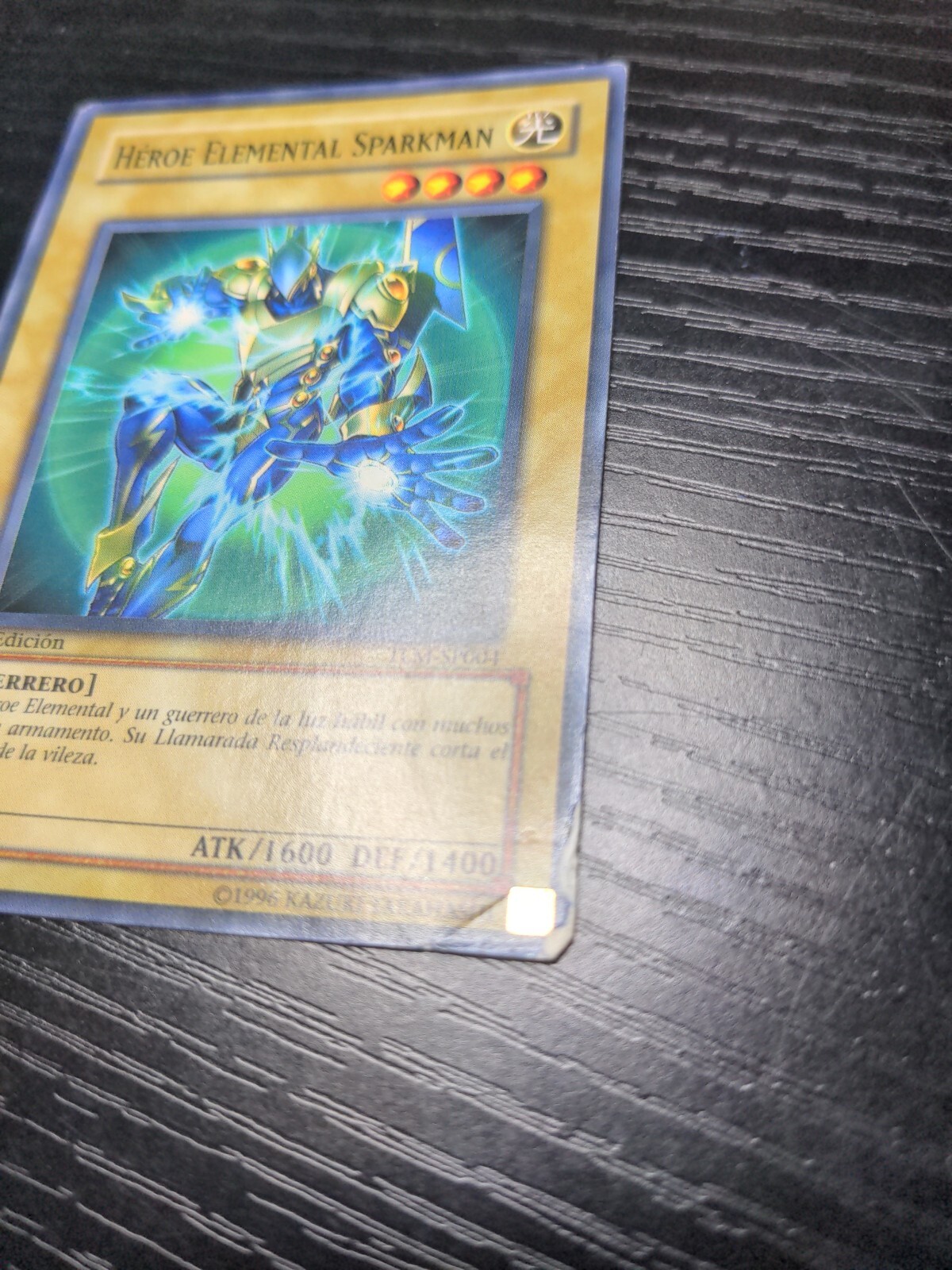 The card is a Spanish 1st Edition Elemental HERO Sparkman from the Yu-Gi-Oh! TCG set - Yugi -. Manufactured by Konami in 1996, the card features the character Sparkman and belongs to the Warrior Creature/Monster Type. This collectible card game individual card is a valuable addition for fans and collectors of Yu-Gi-Oh! trading cards, specifically those interested in the Elemental HERO series.