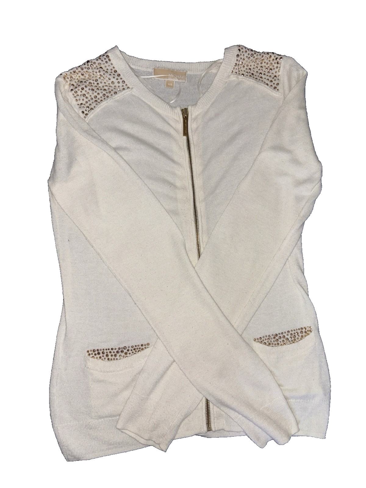 This Michael Kors Women's Cardigan in size small is a stylish and versatile addition to any wardrobe. Made from knit fabric in a classic ivory colour, this long sleeve cardigan features a round neckline and a sophisticated Michael Kors branding. Perfect for all occasions, this cardigan is a timeless piece that can be dressed up or down with ease, this cardigan is a must-have for any fashion-forward woman looking to elevate their style with a touch of luxury.