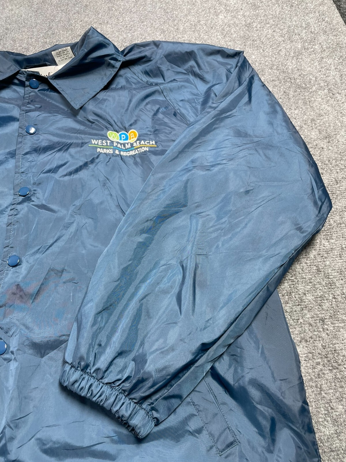Get ready for any outdoor activity with this stylish Cardinal WPB Parks & Recreation windbreaker jacket. Made of durable nylon material and lined with soft polyester, this jacket is perfect for travel, workwear, and various outdoor activities such as walking, cycling, hiking, and running errands. The jacket features a solid blue color with embroidered snap accents, a point collar style, and elastic cuffs with drawstrings for a comfortable fit. In addition to being practical, this jacket is also fashionable with its regular fit and 80s/90s theme. It comes in size XL and is machine washable for easy care. The jacket has pockets for convenient storage and is insulated with polyester for added warmth during the colder seasons of fall, winter, and spring. Whether you're a fan of outdoor activities or just looking for a stylish and comfortable jacket, this Cardinal windbreaker is perfect for you.
