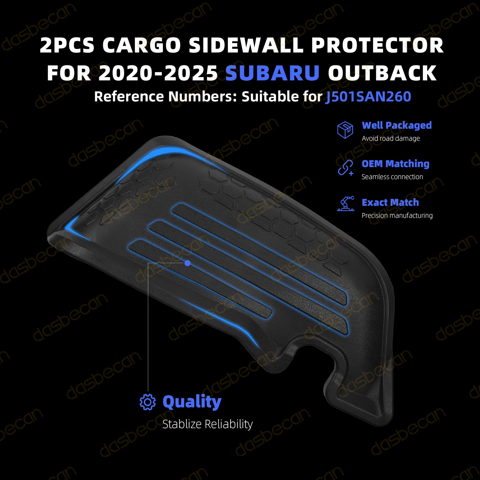 Features & details 【 Compatible with 】 2020-2025 Subaru Outback 【 Manufacturer Part Number 】J501SAN260 If you are not sure about the part fitment to your vehicle, please supply your Vehicle Model / VIN number / OE Part Number we will check it for you! 【 Description 】 Type: Cargo Sidewall Protector Set Material: Rubber Features: Waterproof Attachment Type: Insert Fitment Type: Direct Replacement Placement on Vehicle: Rear, Cargo/ Trunk 【 Features 】 Protection. Extend protection to the rear cargo and wheel well trim panel areas with the Cargo Sidewall Protectors. Provides optimal protection in the rear cargo area when used in conjunction with the Rear Seatback Protector and Cargo Tray. Durability. Durable construction, engineered for precise fit and texture-matched to complement the functionality and appearance of the Rear Seatback Protector and Cargo Tray. Easily removable and washable. T he Cargo Sidewall Protectors can be easily removed, rinsed clean and easily reinstalled. These sidewall protectors maintain their appearance and functionality over time, making essential accessory for maintaining your vehicle's interior in excellent condition. 【 Package includes 】 2 Pcs Left & Right Cargo Sidewall Protector Set 【 Note 】 Compatibility Chart is for the reference only. The best way to check compatibility is to check the Part Number on your old unit if possible. Please allow the slight color difference caused by the shooting light and 1-3cm error due to manual measurement, and make sure you do not mind before you place the order. 【 Service & Warranty 】Purchase from DASBECAN, enjoy 1 year no worries-warranty, whenever you met issue when installing or using, please contact us via eBay Message, and we will reply within 24 hours and help solve the problem. Customer Question & Answers Q1: Will This Part Fit My Vehicle? We list all the compatiblity, if your vehicle does not show up on the compatibility table at the top of our listings, welcome you to contact us for free consulation before purchasing a product. Q2: Does they come with warranty? All of our product comes with 1-year warranty, but some times you need to pay the shipping fee. Q3: How to use it? If you don't know how to install this accessory, welcome to contact us, we will provide you with a video guide. Payment Shipping Warranty & Service Returns/Exchanges Contact us Payment Most of the payment methods are available, such as Paypal, Payoneer, Credit Card. Within 1 day of receiving your payment, we will start processing your order. Shipping All Items Will Be Ship Within 1working Days, and We Will Ship out All Orders As Soon As Possible After Payment Verified, Please Allow up to 1-6 Business Days for Delivery. Why Choose the Us Stock? 1. Us Local Shipping, No Extra Customs Cost. 2. Fast Delivery: 1-6 Working Days Delivery. Warranty & Service If the item is installed or defective after 30 days , please check our warranty page. We offers an one-year warranty on all parts sold unless otherwise noted. We aim to provide the high quality auto parts and accessories, but some rare cases happened. We offer following options for warranty service: If the item fails after installation : You must provide your valid purchase record , with photos or videos proving the product's own fault via eBay messages, after which we will provide you with a replacement warranty service. Please note that this warranty only applies to automotive parts installed in full compliance with the installation instructions, as well as return requests for which photos and videos proving the product's own fault are provided to us. If we send you the wrong parts: You can promptly send us a message to inform us, and we will prioritize arranging a replacement. Meanwhile, we will provide a return label for you to send back the incorrectly shipped items. Shipping Damage. We use UPS Ground, Fedex and USPS First class to ship all items . Buyer should check the parcel condition before sign the signature . Please refuse to sign the parcel if you noticed something wrong , and get a shipping damaged report from carrier. We will send you a replacement at the same day once you provide the shipping damage report . We won’t cover any lost if buyer don’t check the parcel condition before the signature. This warranty does not cover any expenses incurred in the removal and / or re-installation of the item. Specifically, this warranty does not cover any expenses for time, rental, or other parts not purchased from us, or any labor. This warranty does not apply, and will be voided, if the item sold has been damaged by abuse, misuse, accident, neglect, or alteration, or if it has been repaired by anyone . Your warranty will be null and void if the item fails due to improper installation or use. If the item sold should prove defective in material or workmanship within the warranty period, please contact us immediately. Returns/Exchanges Please contact us via eBay messages between 9:30 a.m. and 6:00 p.m. PDT, (Monday to Friday) to obtain a return label with a return number. Without a Return Authorization Number, we will not be able to identify your return request. All returns must be done within 30 days after receiving the package. Parts must be new and unused in the original condition : including box, packaging and all other accessories,or we will charge you a partial costs. Return requests initiated directly on the eBay platform may not be processed promptly due to delays in eBay's procedural timeline. We highly recommend that you contact us first to receive priority processing. If you receive an item that is incorrect, damaged, defective, or not as described, please contact us and provide relevant evidence (such as photos, videos, or other valid proof of the issue). We will cover the associated costs and arrange for a partial refund, full refund, or replacement. Contact us If you encounter any problems during purchase or use, please contact us via eBay message direc