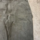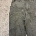 The Carhartt B136 MOS Men's Size 32x30 Double Knee Carpenter Pants in Moss Olive Green are a durable and stylish choice for casual or workwear occasions. Made with cotton canvas fabric, these straight leg pants feature a high rise and a zip and button closure. With a solid green color and a flat front design, these pants also include accents like a logo and pockets for added functionality. Perfect for those looking for a rugged, USA-inspired style with a grunge and streetwear aesthetic.