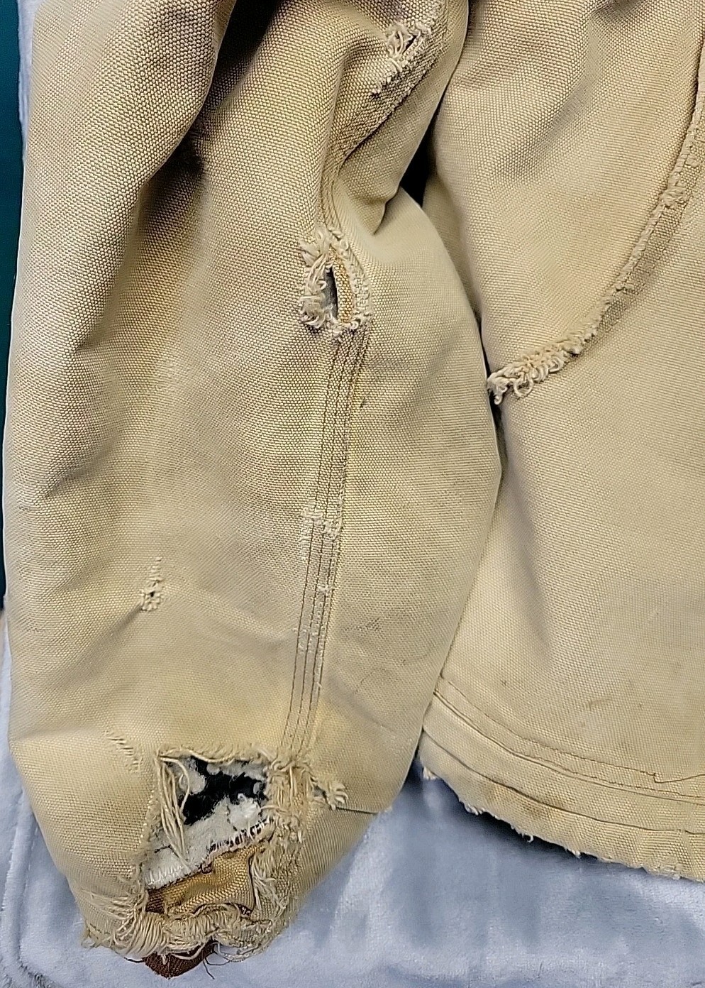 2002 Carhartt Chore Coat. Authentic Heavily distressed frays holes stains this boat has it all. Nice Quilted soft inside. Size 42.