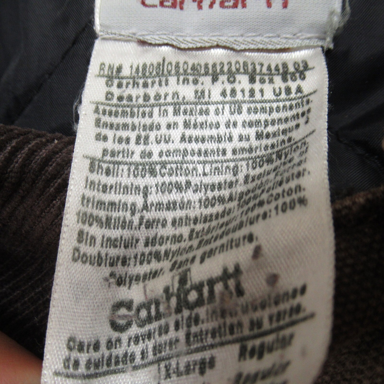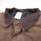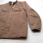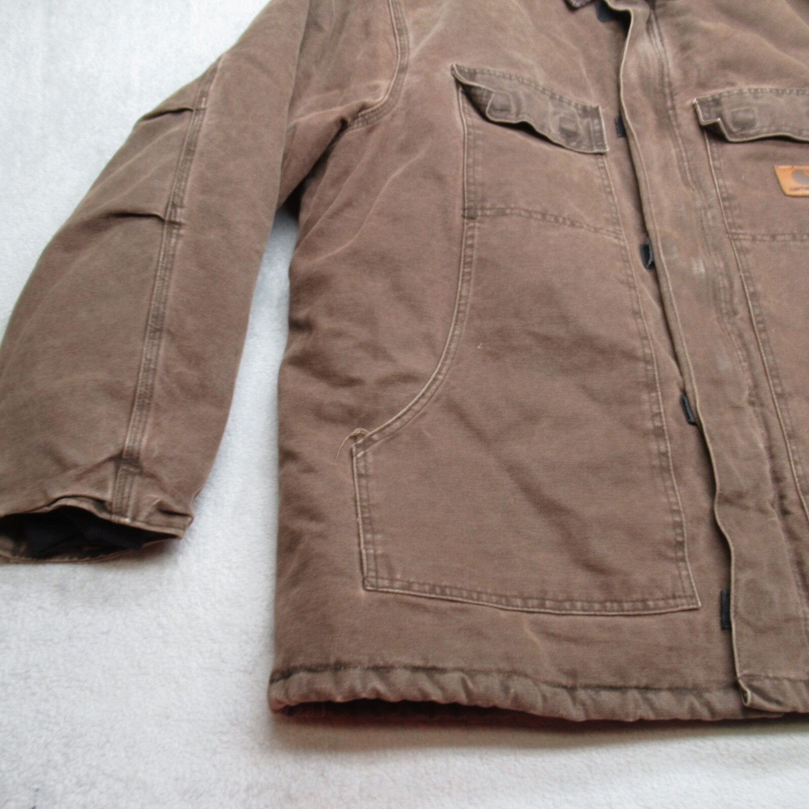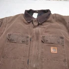 A rugged Carhartt work jacket, perfect for outdoor tasks or casual wear. This durable chore coat features a classic design with a corduroy collar, multiple pockets for tools and essentials, and a full button-down front. The jacket is made from sturdy canvas material, providing both comfort and protection. Type: Jacket Style: Utility Jacket Outer Shell Material: Canvas Department: Men Color: Brown Lining Material: Polyester Fabric Type: Canvas Features: Lined, Pockets, Corduroy, Full Zip Pattern: Solid Accents: Button, Logo Description may be generated by AI. · Fast Handling Time · Contact us via message for prompt resolution with any issues