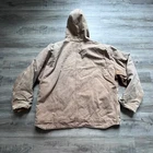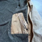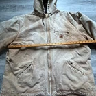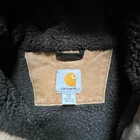well loved carhartt j141-211 sherpa lined hooded Detroit jacket. super distressed and some wear rips throughout as seen in photos-adds character. two front slit pockets as well as zippered chest pocet. two interior pockets-one side zippered and one side velcro. hodded with drawstring. fully sherpa lined. mens size 3x tall xxxl heavy jacket