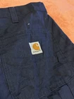 The product is a pair of Carhartt Dungaree Fit navy blue workwear baggy pants in size 36x32. These pants are designed for men and are suitable for work occasions, with a style reminiscent of carpenter pants. The navy blue color and baggy fit make them a versatile and comfortable option for outdoor work or everyday wear. Made by the reputable brand Carhartt, these pants are durable and practical for those who need a reliable pair of workwear trousers. 36 x 32 still have rental tag- doubt these were worn. Look great.