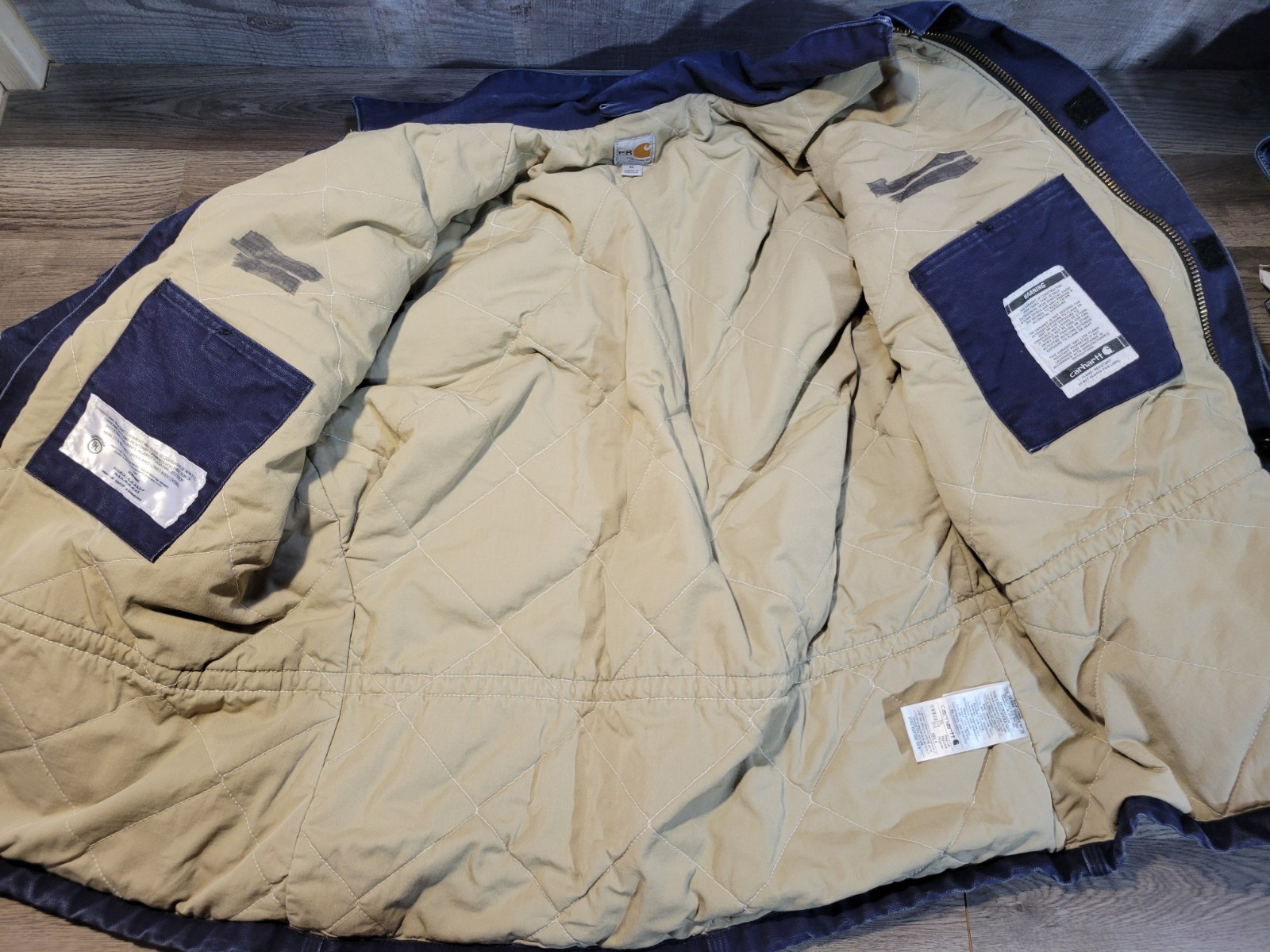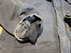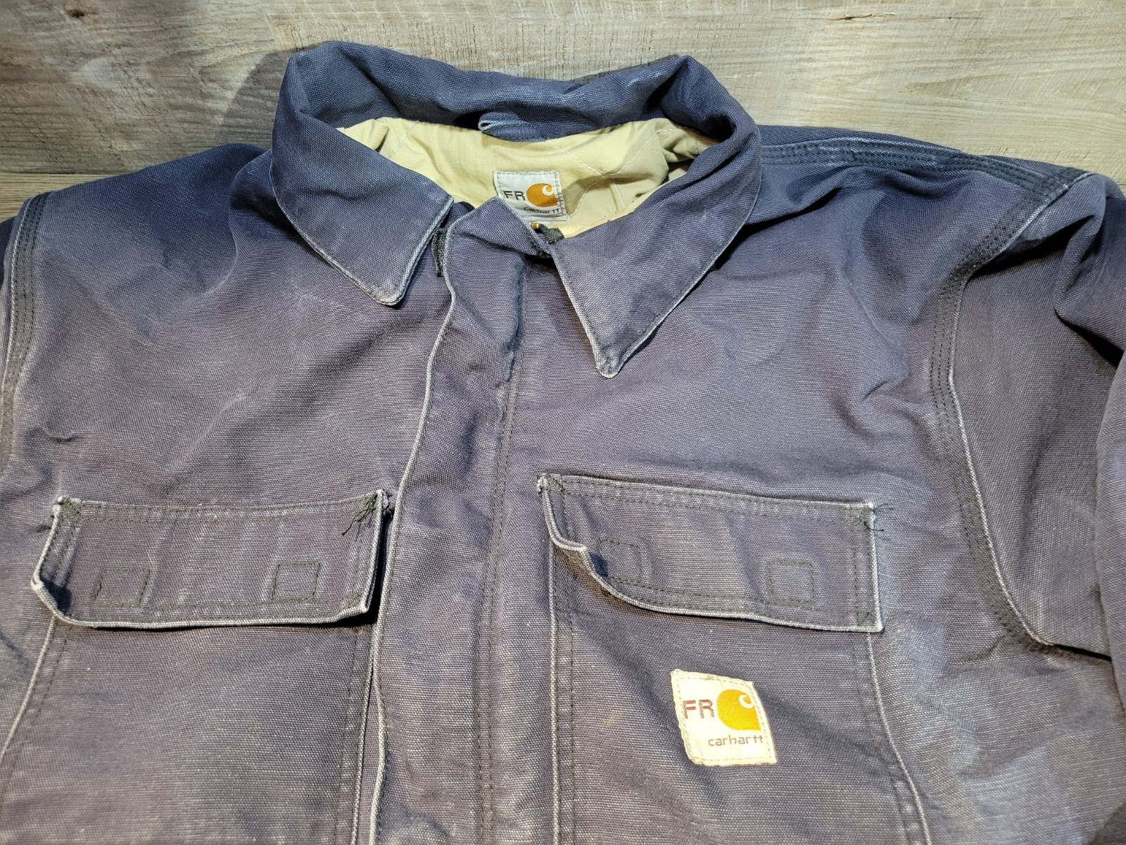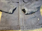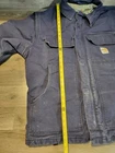 Carhartt FR 101618 410 Blue Duck Canvas Fabric Lined Jacket Coat. In used condition with some fading and distressing. Marker on inside of both sides of chest. Men's size X-Large, measures approx 26" chest x 29 1/2" length. Please use measurements provided for approximate size.