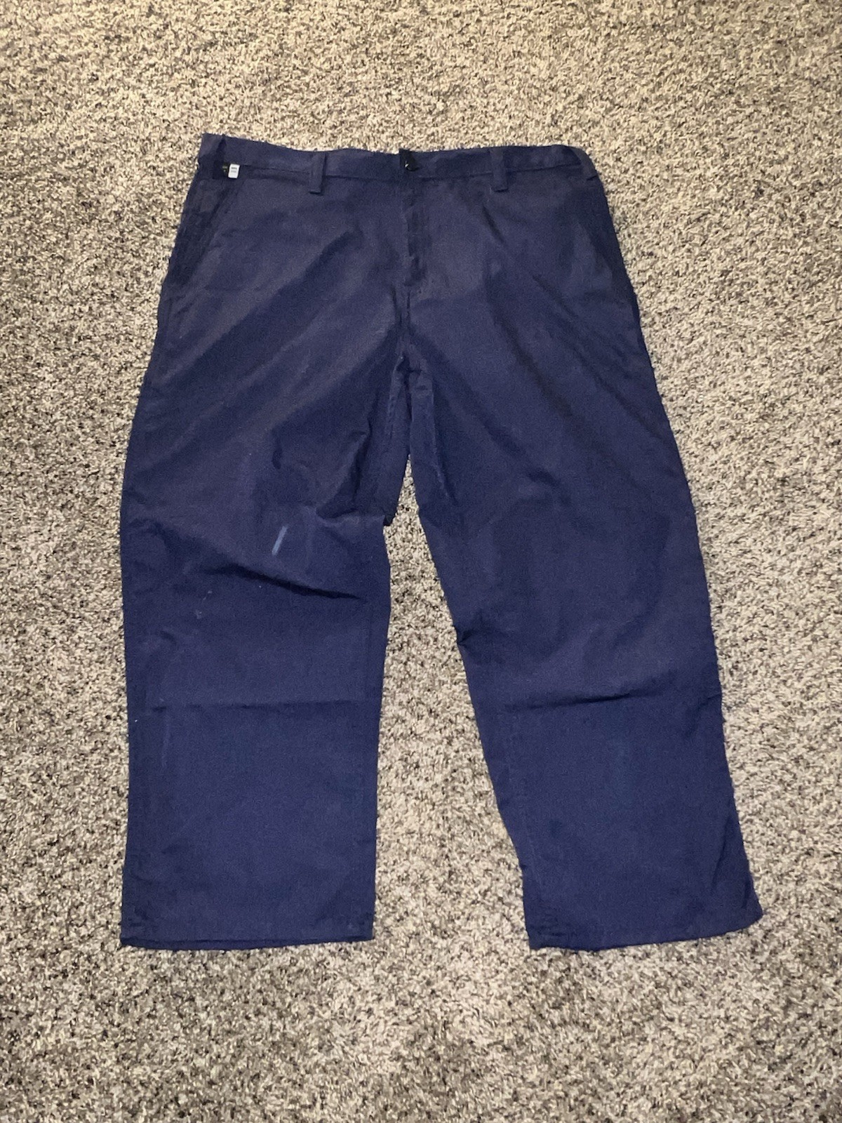 Carhartt FR work pants in heavyweight navy blue flame-resistant fabric, made with 75% Meta Aramid and 20% FR Modacrylic. Features utility side pockets, tool loops, and CAT 2 NFPA 2112 safety compliance. Durable and ideal for industrial or electrical work environments. See photos for details. #carhartt #frpants #workwear #flameresistant #vintage