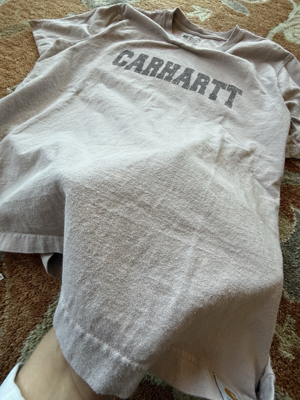 One or two bleach stains really hard to see color of the shirt is a mixture of tan and kind of pinkish skin tone color
