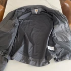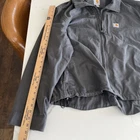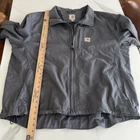 Embrace the practicality and durability of the Carhartt Gray Duck Canvas Jacket, a must-have for those who value function over fashion. Designed for the working man, this jacket is suited for a variety of occasions, from casual wear to rigorous workwear. The robust cotton blend outer shell paired with a cozy polyester lining ensures you stay comfortable through fall, spring, and winter. This men's size 2XL jacket features a full zip closure, collared neckline, and multiple pockets, including zipped pockets for secure storage. Its solid gray color and subtle logo accents offer a sleek, yet masculine look, while the mid-length cut provides ample coverage. The jacket is easily cared for with its machine washable fabric, making it a practical addition to any wardrobe. Excellent preowned condition. See photos for measurements.