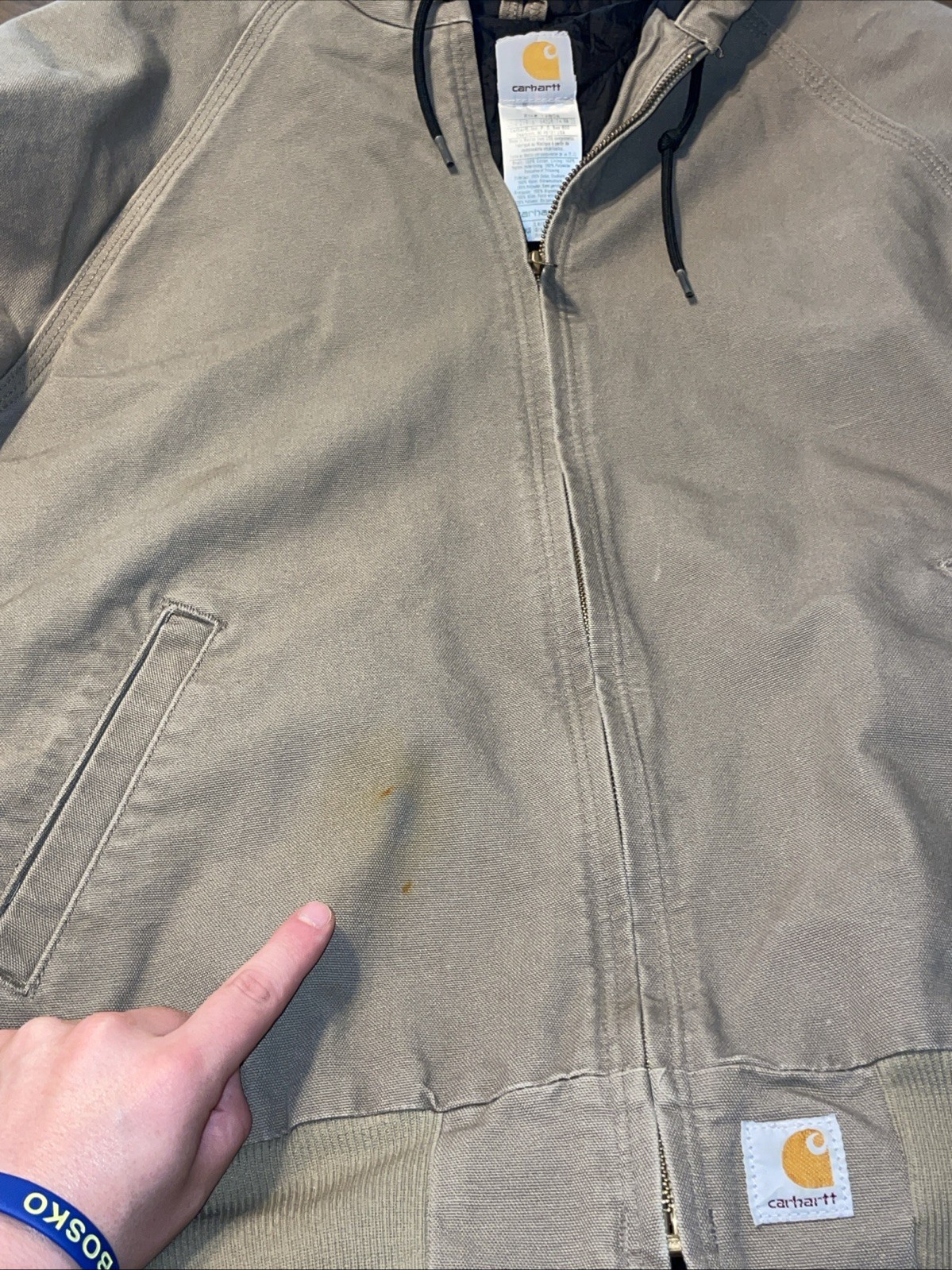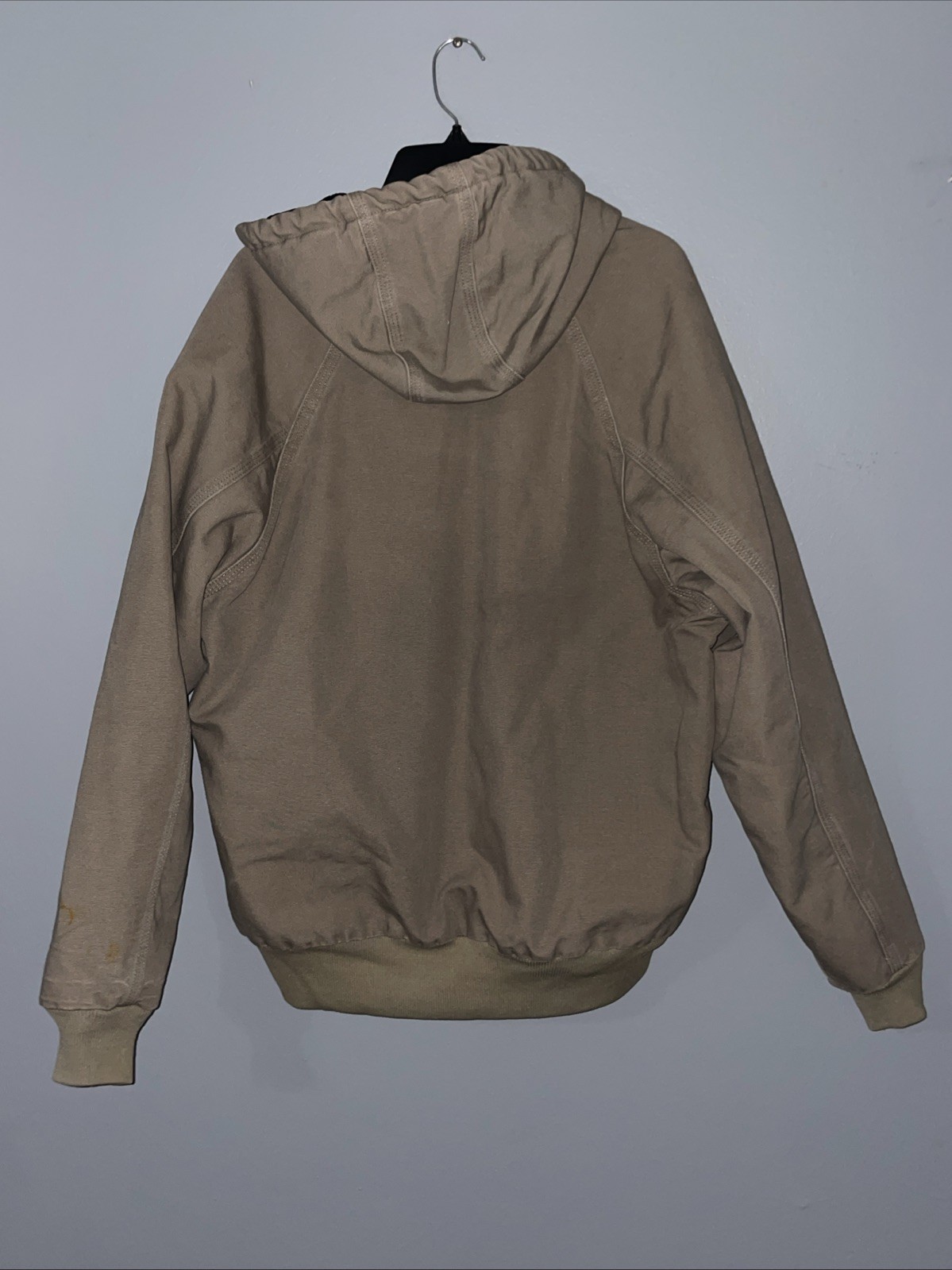 The Carhartt Hooded Coat Jacket in size Large is a stylish and functional outerwear piece suitable for casual or workwear occasions. Made with durable cotton canvas outer shell and lined with cozy polyester, this jacket offers both protection and comfort. The full zip closure, hood, and pockets provide added convenience and versatility. The solid brown color and branded accents give it a classic and reputable look, perfect for the winter, fall, and spring seasons. With its regular fit and bomber jacket style, this Carhartt jacket is a practical and fashionable choice for men. ****2 Noticeable stains one in the front near the pocket and one on the sleeve. See pictures****