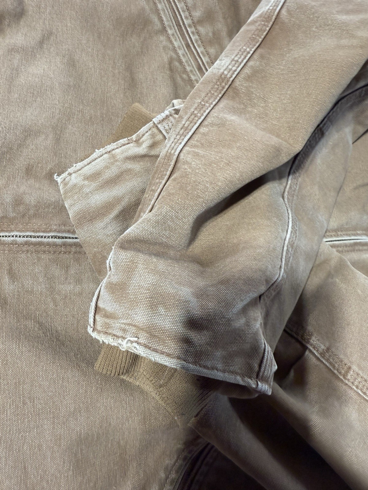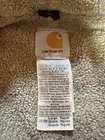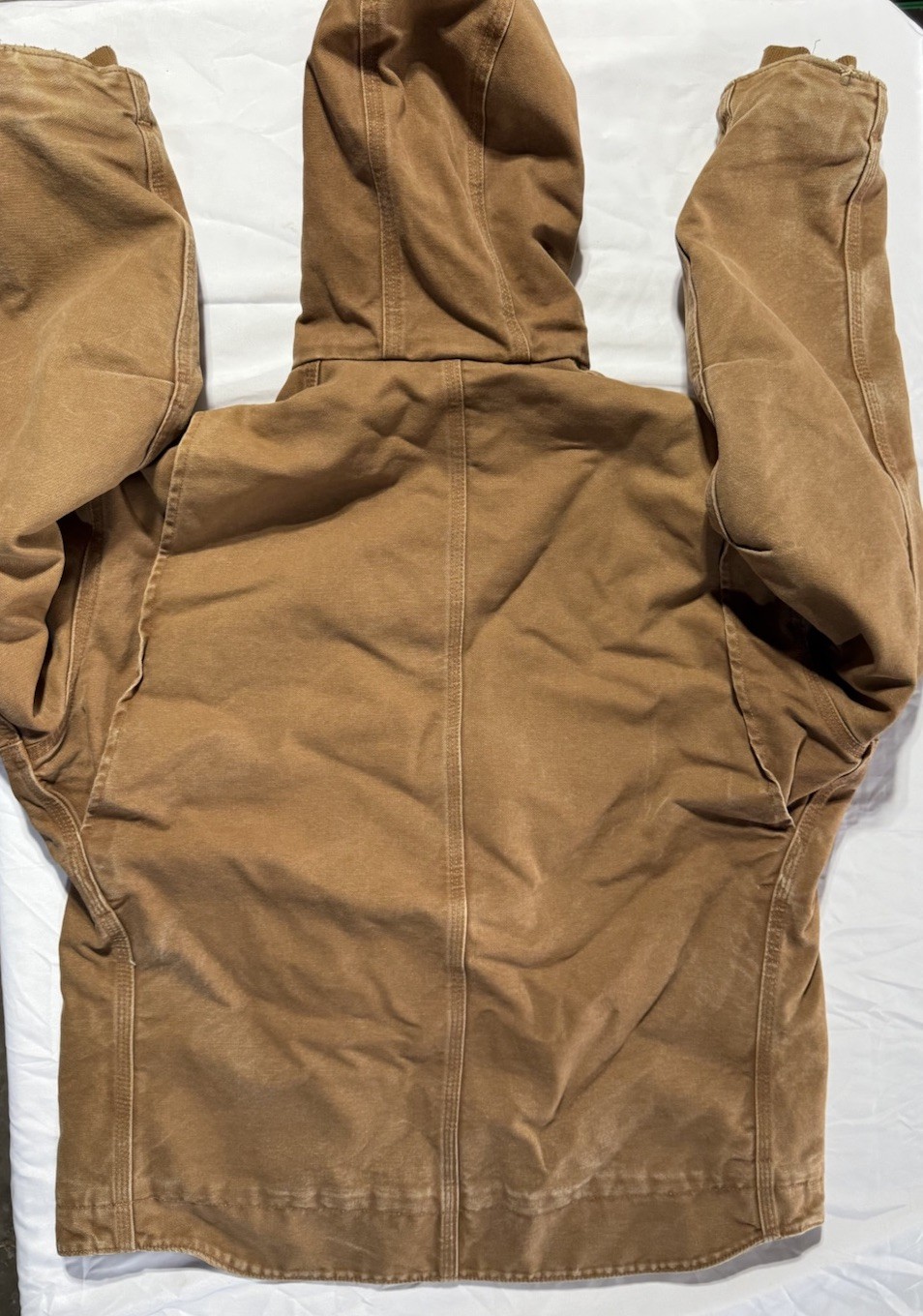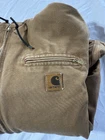 Men’s carhartt jacket from early 2000s. Classic fit with knit cuffs, body w/hood Sherpa lined. Plenty of pockets inside and out. Sleeves are lined with nylon. Slight wear on cuffs and inside of arms (see pictures).