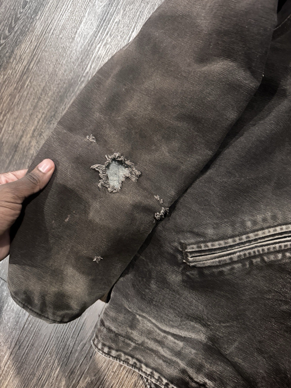 Embrace the classic durability with the Carhartt J141 DKB Men's Brown Canvas Sherpa Lined Hooded Detroit Jacket. A timeless piece that effortlessly blends functionality with style, this jacket is designed for those who appreciate the value of a well-made overcoat. The robust cotton canvas outer shell provides ample protection, while the cozy wool lining ensures warmth during the cooler seasons of fall, spring, and winter. This jacket's versatile design caters to various occasions, from casual outings to demanding workwear environments. It features a convenient zip closure, a hood for added protection against the elements, and the iconic Carhartt logo for a touch of brand authenticity. The mid-length cut offers coverage without compromising mobility, making it an ideal companion for walking or outdoor activities. Machine washable and crafted with care in Mexico, this regular fit, size XL jacket is a testament to lasting quality and comfort.