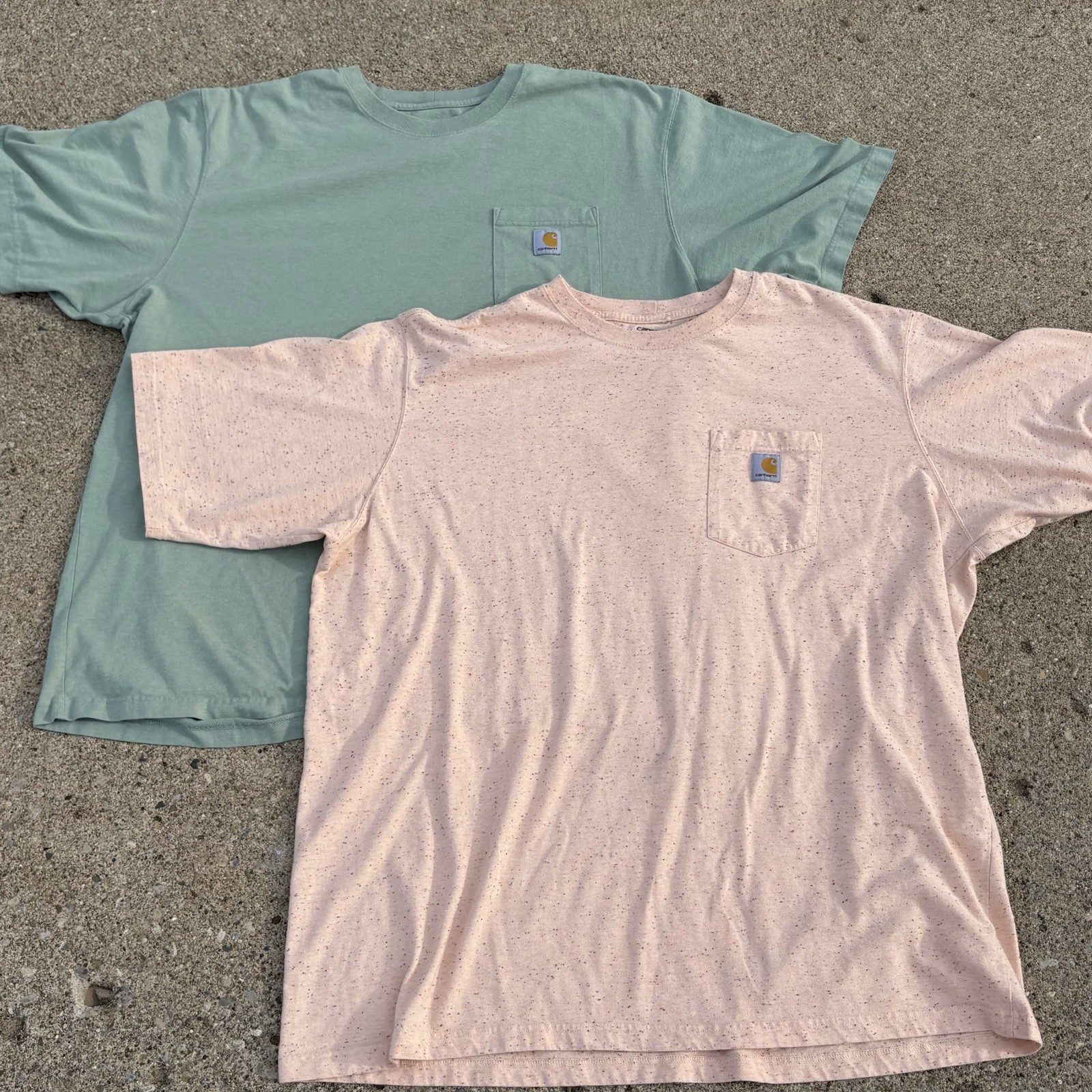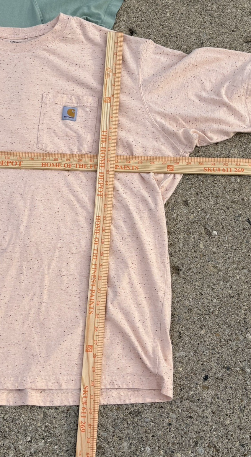 Set of two short-sleeve Carhartt t-shirts in size 3XL. Includes one light green and one speckled peach tee, both with chest pockets and logo patch. Excellent condition with no signs of wear. See photos for condition and measurements. Keywords: carhartt, men’s t-shirt, size 3XL, short sleeve, green, pocket tee, casual wear, workwear, cotton blend