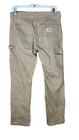 The Carhartt men's cargo pants in tan size 31” x 30” are designed for workwear and casual occasions. Made from a canvas fabric with accents of buttons and zippers, these cargo pants feature a comfortable fit with an 11” rise and straight leg style. With multiple pockets including cargo and slash pockets, these pants are practical for everyday use. The stains on the pockets add a unique touch to the overall style, making them a versatile option for various seasons. Easy to care for with machine washable instructions, these pants are a reliable choice for any wardrobe.