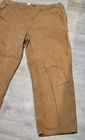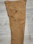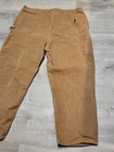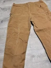 Enhance your work wardrobe with these Carhartt men's dungaree fit carpenter pants. Made of sturdy duck canvas fabric, these pants are perfect for outdoor and classic themed works. The pants feature a mid-rise waist, zip closure, and belt loops for a comfortable and secure fit. See pics for some discoloration, but no damage to the pants. With eight pockets, these pants provide ample space for your tools and personal items. The pants are machine washable, making them easy to care for. The brown color is accented with the Carhartt logo, giving it a classic look. These pants are perfect for any season, whether it's winter, summer, fall, or spring.