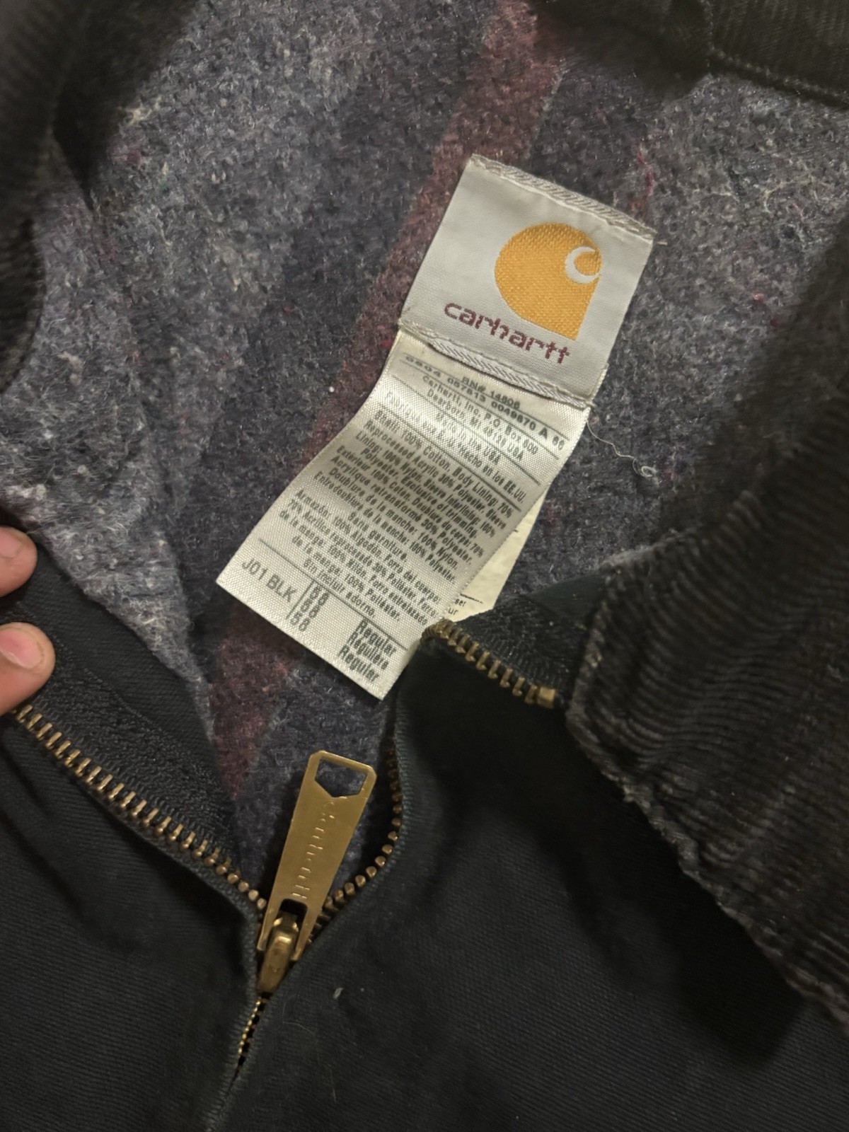 The Carhartt Men's black lined flannel Detroit jacket in size 2XL is a vintage-inspired piece perfect for casual and workwear occasions. Made from durable cotton with a polyester lining, this jacket features a snap closure, full zipper, and wind-resistant properties. The stylish black color with a corduroy top collar and Carhartt logo accents add a touch of personalization to this classic Detroit-themed jacket. With multiple pockets and a versatile design suitable for all seasons, this jacket is ideal for everyday wear or outdoor activities like walking and hunting.