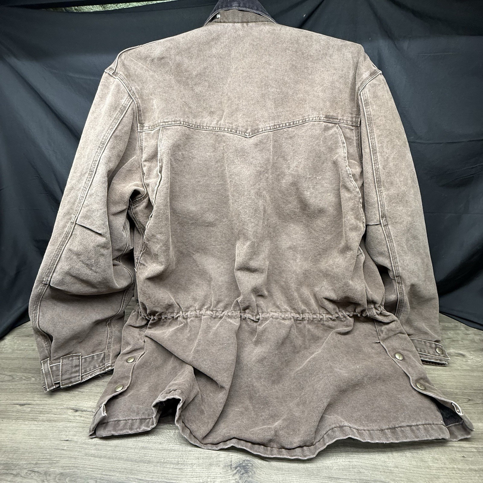 Crafted for durability and comfort, this Carhartt C52 jacket is a versatile addition to any wardrobe. The brown canvas material is resilient, making it suited for various outdoor activities and work environments. Its mid-length cut and spread collar offer a classic field jacket silhouette, while the blanket lining provides extra warmth for all seasons. This jacket features a solid pattern and a sturdy zipper closure, with additional pockets for practicality. Designed for the big and tall man, it boasts a regular fit in a 2XLT size. The jacket's heritage is evident in its vintage appeal, yet it retains a timeless appeal for casual occasions.