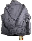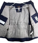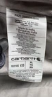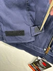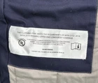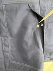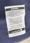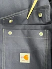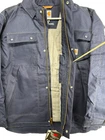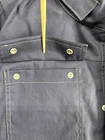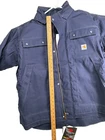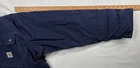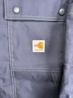 This Carhartt Men's Full Swing Flame-Resistant Quick Duck Jacket in size XL is a navy blue water-resistant jacket perfect for winter and fall. Made with durable cotton/nylon fabric, it features a stand-up collar, zip and snap closures, lined and insulated for warmth, with zipped pockets and a full zip front. The jacket is designed for outdoor workwear, with accents like buttons, zippers, and a logo, embodying a classic outdoor theme.