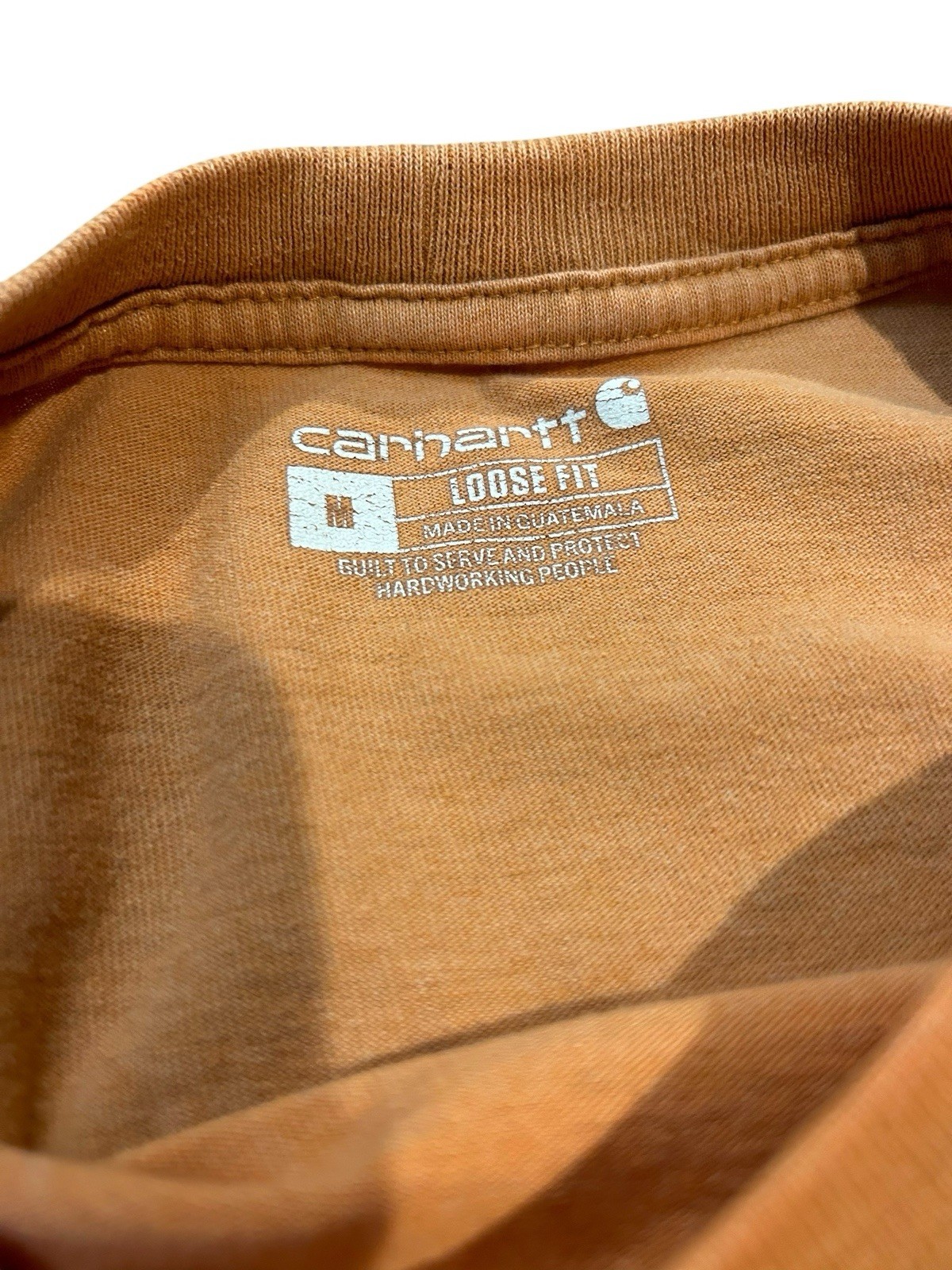 Has a very small discoloration on the front as a pictured Carhartt Men's Loose Fit Short Sleeve T-Shirt, Size M, Heavyweight Pocket Orange