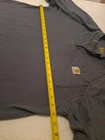 There is some color fading due to the washing process The Carhartt Men's Long Sleeve Shirt in size medium features a solid blue color with a crew neck and long sleeves, making it a versatile option for all seasons. Made of comfortable cotton material, this regular-fit shirt is machine washable for easy care. The shirt also includes a chest pocket and buttoned design, adding practicality and style to its outdoor-themed design. Overall, this Carhartt shirt is a durable and stylish choice for any man's wardrobe.