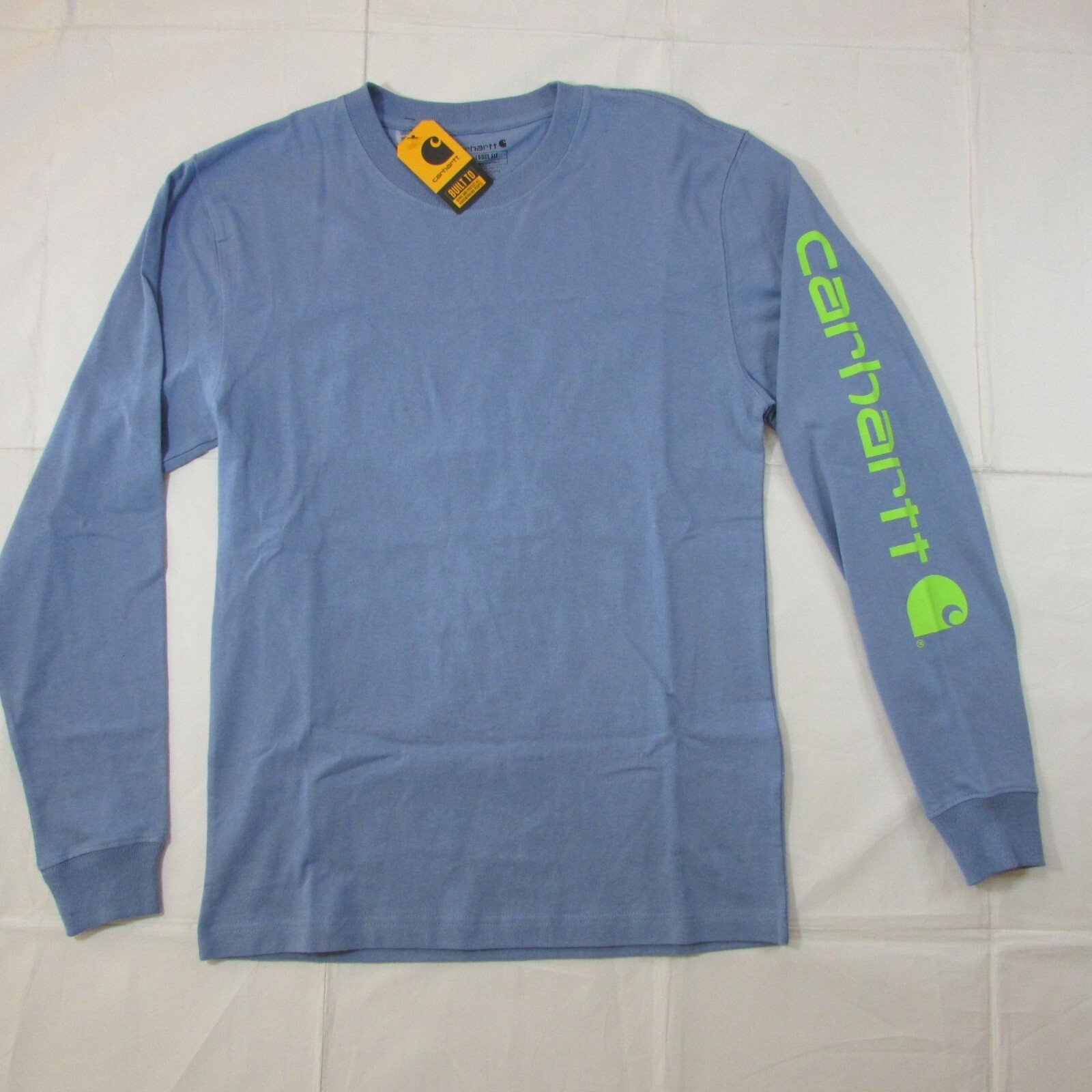Brand new with tags Men's Size Brand: Carhartt Color: Skystone Style # TK0231 Long Logo Sleeve Loose Fit Heavyweight Graphic Tee Shirt Top Approx Measurements: (Chest x Length) XS - 18.5" x 28" S - 20.5" x 29.5" M - 22.5" x 30" LT - 24.5" x 33" 2XL - 28.5" x 32.5" 2XLT - 29" x 34.5"