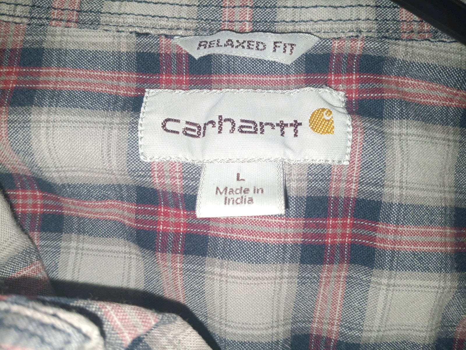 This Carhartt Men's Vintage Button-Up Shirt in size L features a relaxed fit with long sleeves and a collared neckline. Made of cotton in a gray plaid pattern, this shirt is perfect for casual or workwear occasions. It comes with accents like buttons and pockets, making it a stylish and functional addition to your wardrobe. Machine washable and ideal for the seasons of summer, fall, and spring, this vintage shirt from Carhartt exudes quality and timeless style.