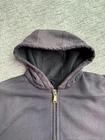 Carhartt Hoodie Mens XL Black Full Zip Workwear Heavyweight Distressed Condition: Fair used condition with heavy wear and distressing throughout. Visible fading across the exterior. Several small white paint or bleach marks and scattered stains/spots to front, pocket, and sleeves. Noticeable pilling and lint on the inner mesh lining. Significant wear at both sleeve cuffs including fraying and a small hole. Interior mesh shows a hole near the zipper seam on one side. Please see photos for all details and closeups of wear and flaws. 80% cotton / 20% polyester (based on typical Carhartt fleece blend, tag is heavily faded and hard to fully read) Carhartt patch logo on front pocket Heavyweight hooded sweatshirt style with brass Carhartt-branded zipper Two front hand-warmer pockets Ribbed/cuffed sleeves and waistband Color: Black (faded) Tag size: 2XL (Mens) – see photos for measurement references Approximate flat measurements (for fit reference): - Chest (pit to pit): 28" - Length (top of shoulder to bottom hem): 28" - Sleeve length (shoulder seam to cuff): 25" Made in the USA (per tag details and Carhartt era/label style) Ideal for grunge, workwear, raw/heritage style, or everyday use in cold weather