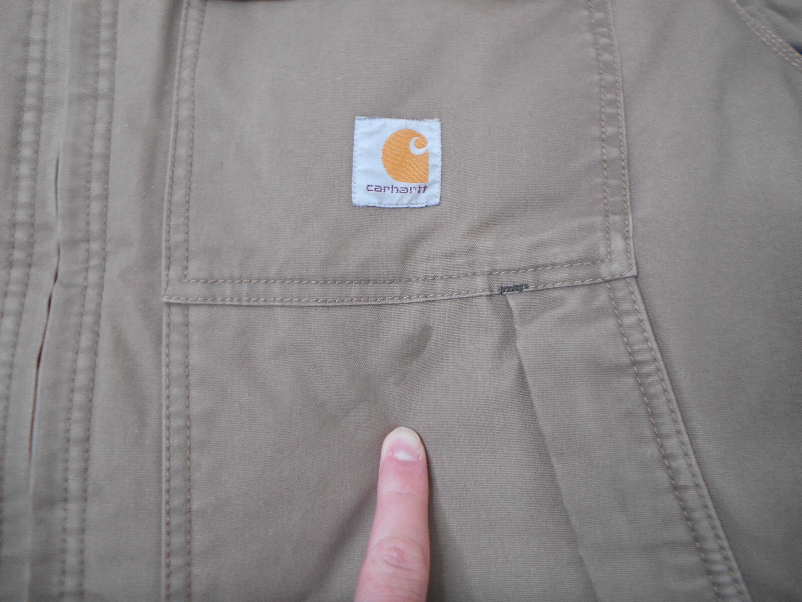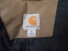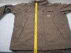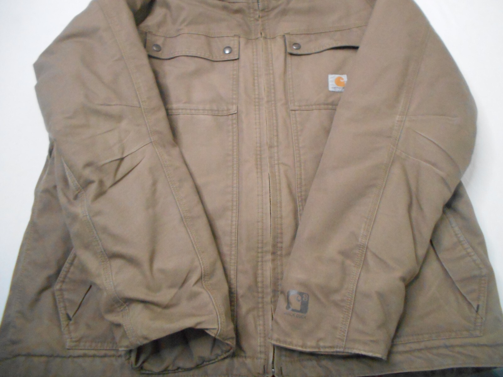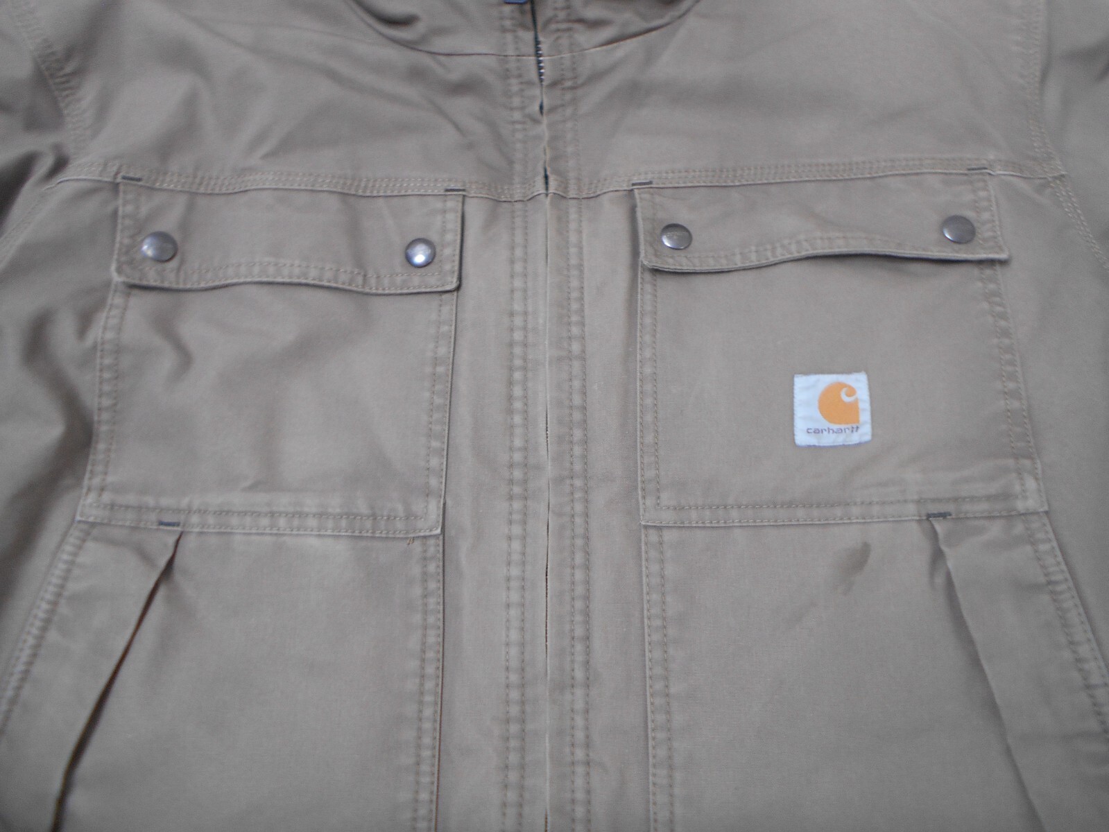 This Item of Used clothing has some wear and such from use and age. All of the things that are wrong with it can be found in the condition description and also there are pictures of them as well. Also the measurements are included in the photos near the end. Please refer to both before buying. Message me if you have any questions! This Carhartt Woodward Work Jacket in Canyon Brown is a versatile and durable jacket for men in size XLT. Made of a cotton blend fabric with a nylon lining, it features a full zip closure, pockets, and polyester insulation. The relaxed fit and mid-length design make it suitable for casual or business occasions, with a workwear theme and zipper accents adding a stylish touch.