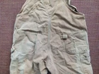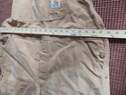 Pre-owned Carhartt Overalls Bib Double Knee Tan, duck canvas. size tag gone check pics for measurements, Inseam measures to 24 inches but is hemmed about 4 inches making them to 28 inches (just use seem ripper if needed longer) waist about 42 , color fading throughout, stain on back leg, but no holes, great condition