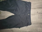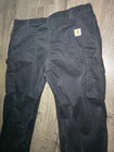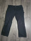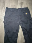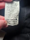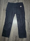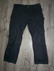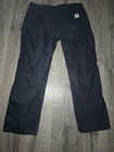 These Carhartt Pants in size 38x30 are black Carpenter utility pants made of cotton canvas. They feature a mid-rise, straight leg, and a relaxed fit for comfort. The pants have a flat front with a zip closure and come with a logo accent. Suitable for workwear, the pants are breathable and ideal for outdoor activities or work wear in various seasons.