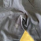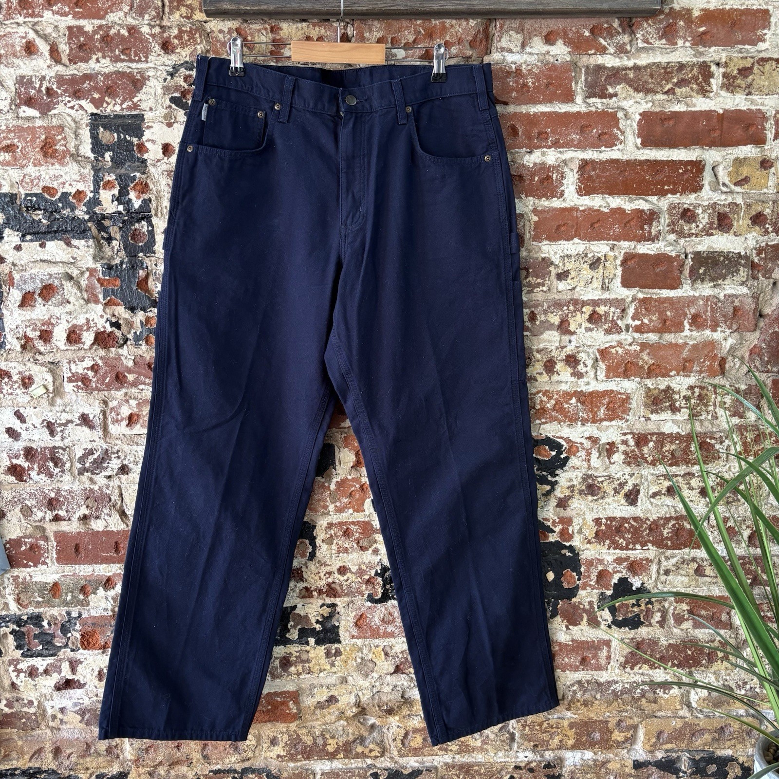 Pants has stains on the back you can see in the last picture. The product is a pair of Carhartt men's navy blue pants in size 36x30, featuring a loose fit utility work style designed for carpenters. Made of durable cotton canvas fabric, these pants have a zip closure, straight leg design, and multiple pockets for convenience. The relaxed fit and flat front make them comfortable for long hours of work, while the solid blue color and logo accents add a touch of style. Perfect for winter, fall, and spring seasons, these Carhartt pants are ideal for active outdoor work environments.