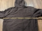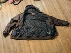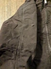 I have the measurements in the photos. Please see that there are some little holes in each long sleeve arm. There is one small burn hole on the interior but it does not affect the build quality. Please ask if you have any questions. This car has plenty of life left in it. Embrace the classic workwear aesthetic with the Carhartt Canvas Hooded Bomber Jacket. Designed for durability and comfort, this jacket features a robust cotton canvas outer shell in a versatile dark brown, complemented by a quilted nylon lining for added warmth. The mid-length cut and bomber style offer a timeless look, while the hooded design provides extra protection against the elements. This jacket is tailored to fit a size XL in the regular size type, making it a suitable choice for a variety of body types. It's equipped with a solid pattern and subtle zipper accents that enhance its functional appeal. Whether you're facing the chilly spring breeze or requiring reliable outerwear for casual occasions, this bomber jacket is an adaptable addition to your wardrobe.