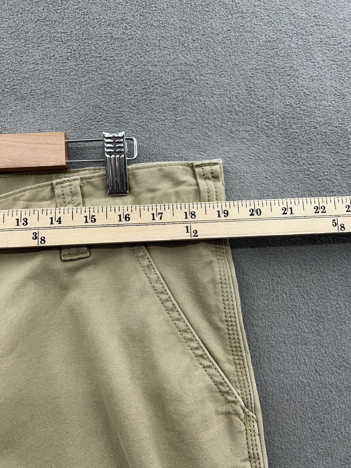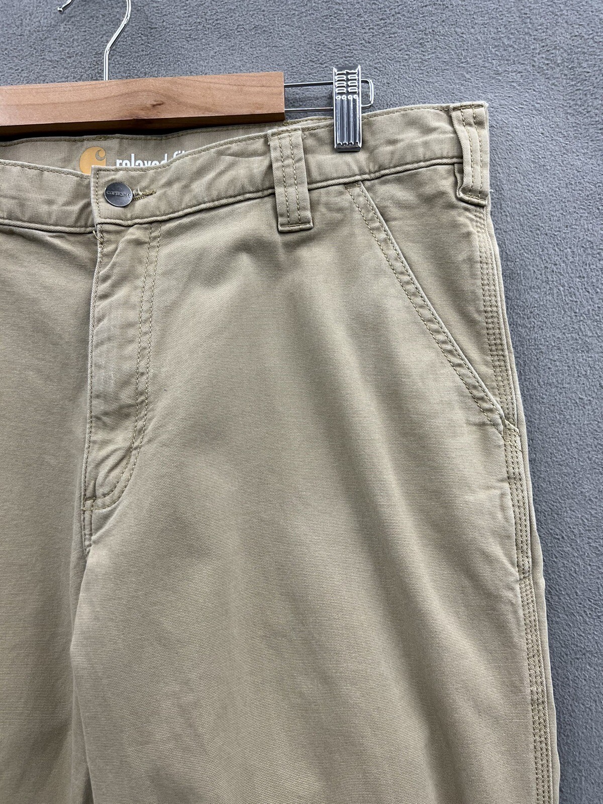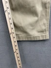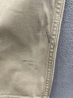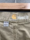 Small dirt/grease mark on the bottom of pant leg. This pair of men's work pants from Carhartt is perfect for any occasion, whether it be workwear, travel, or casual outings. The pants feature a relaxed fit with a straight leg style, and a waist size of 38 inches. The closure is a combination of a zip and button, while the front type is a flat front. Made from a durable cotton blend fabric with a beige color and solid pattern, these pants have a mid-rise of 10-12 inches. The design includes various pocket types such as cargo, 5-pocket, and slash pockets, providing ample space for storing essentials. The pants also feature accents like the company's logo, and are suitable for all seasons of the year. Get your hands on these classic outdoor-themed khakis today!