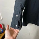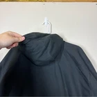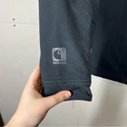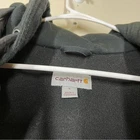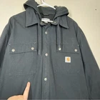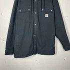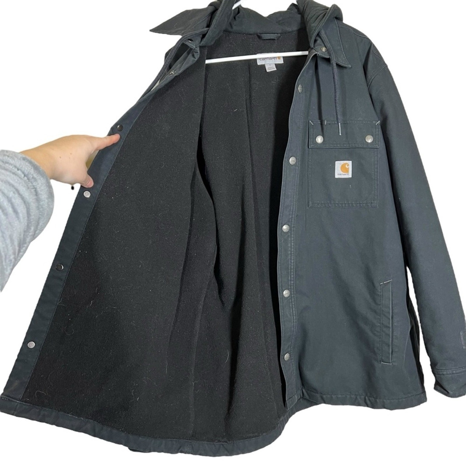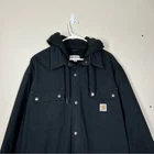 Carhartt Roane Duck Hooded Shirt Jacket Size Large Color: Black Fleece lined, micro fleece Snap button front 2 snap button chest pockets 2 front pockets 1 interior pocket Carhartt quick duck Drawstring Water repellent finish Style: 100586001 Flaw: 1 small spot on the front as shown & some pet/animal hair as shown Approximate measurements laying flat Chest 24.5” Length 31”