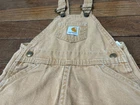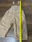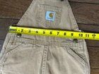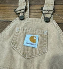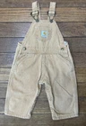 The Carhartt Toddler Overall Bibs are designed in a solid tan brown color with a sleeveless style and snap closure for easy dressing. Made from 100% cotton, these one-piece bibs are lightweight, breathable, and machine washable. Featuring adjustable straps, pockets, and a Carhartt logo, these overall bibs are perfect for travel, activewear, or casual wear. The size is 18 months, suitable for unisex babies and toddlers, with a theme encompassing art, USA, nautical, cowboy, classic, and more, making them versatile for various occasions and activities. Pre-owned in good condition as shown. No holes or stains