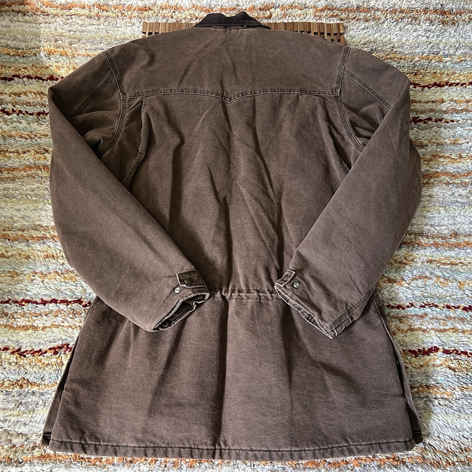 The Carhartt Vintage C52 Canvas Barn Ranch Jacket in XL size is a classic brown blanket-lined chore jacket perfect for men looking for a durable and stylish outerwear option. Made from cotton canvas with a solid pattern, this work jacket features a zip closure and a regular fit. The vintage design adds a touch of nostalgia, while the Carhartt brand ensures quality and craftsmanship. Ideal for those who appreciate retro style and functionality, this jacket is a timeless piece that can be worn for various occasions. Size tag removed. Size determined by measurements in the last picture.